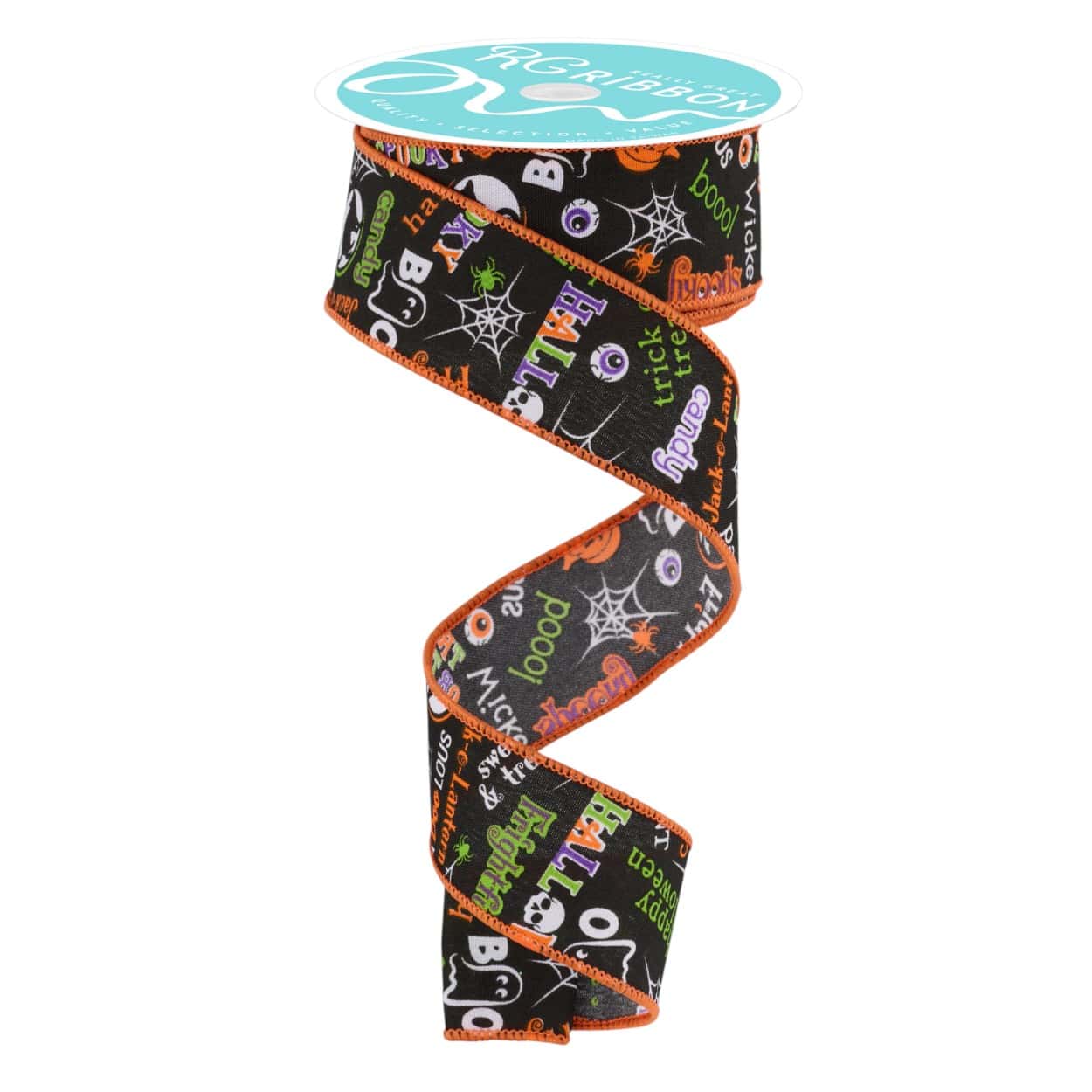 Our Cute Halloween Ribbon is exactly that – cute! The ribbon features all kinds of Halloween sayings and words, along with ghosts, spiders, webs, eyeballs and more on a black background. The ribbon measures 1.5″ wide x 10 yards for a total of 30 feet. The Halloween ribbon is made of polyester and has an orange wired edge. Perfect for Halloween wreaths and craft projects!