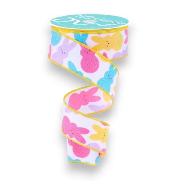 Our Easter Peep Ribbon is so cute and looks good enough to eat! The Easter ribbon features cute little glitter covered buinnies on a white background. The polyester ribbon measures 1.5″ x 10 yds for a total of 30 feet. The ribbon as a yellow wired edge. This bunny ribbon is adorable for Easter wreaths, baskets, bows and decorations. Â