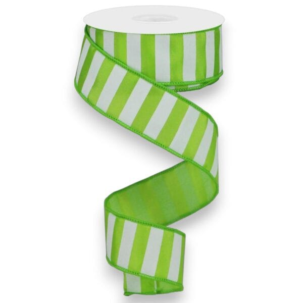 Our Lime and White Stripe Ribbon is wonderful for all sorts of ribbon crafts, especially wreath making! This Lime and White Stripe Ribbon measures 1.5 inches wide by 10 yards for a total of 30 feet. The fabric ribbon is made of polyester and has a lime wired edge. Just perfect for a wreath, bow or craft projects. Â