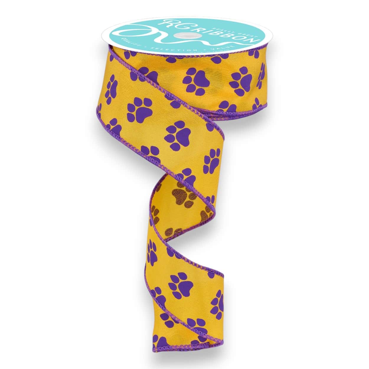 Our Yellow Purple Paw Print Ribbon is wonderful for all sorts of ribbon crafts, especially wreath making! This paw print ribbon features purple paw prints on a yellow colored background. The ribbon measures 1.5 inches wide by 10 yards for a total of 30 feet. It is made of polyester and has a purple wired edge. Perfect for wreaths, bows and crafts.