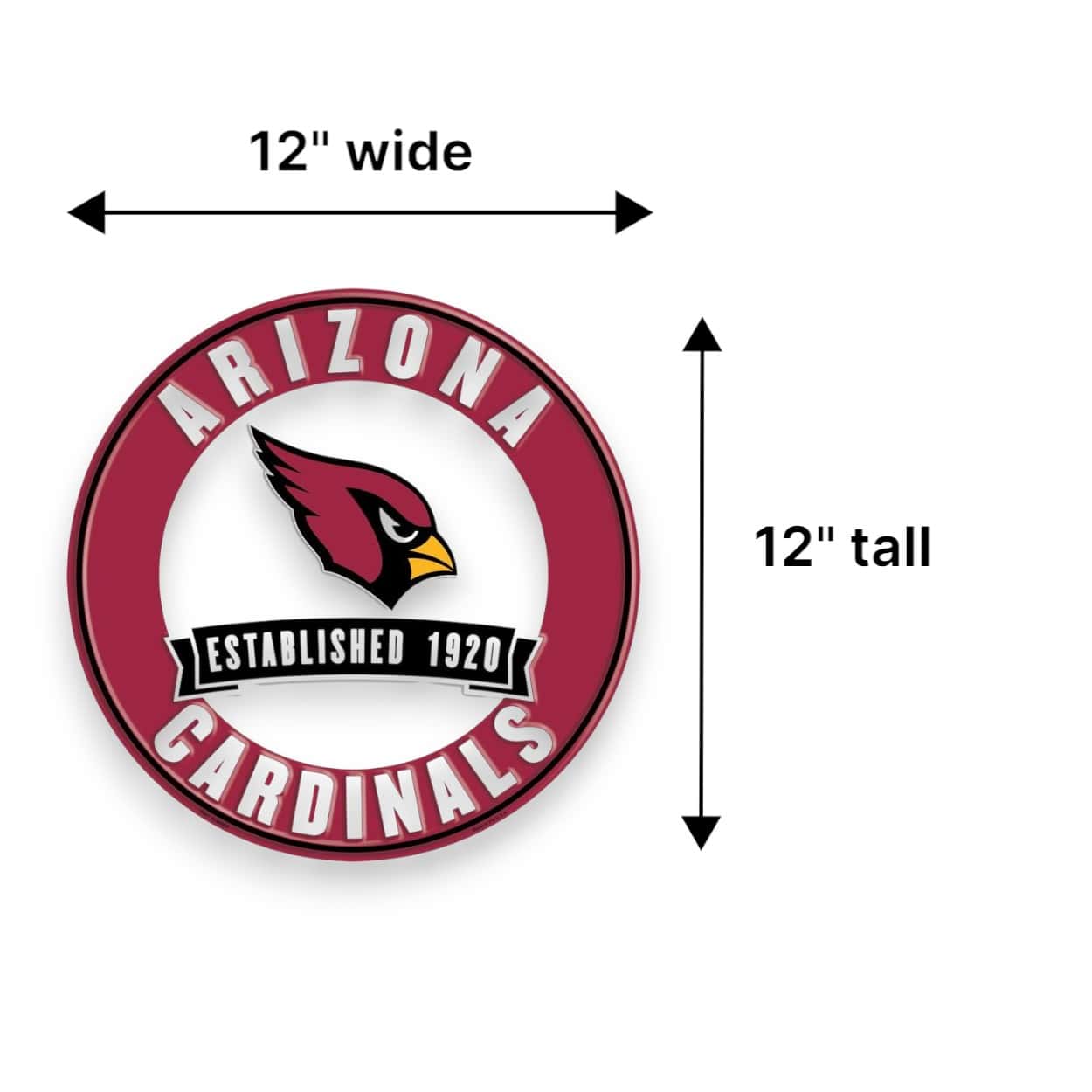 Show your spirit with our Arizona Cardinals Round Metal Sign! This officially licensed NFL sign features the team logo and colors as a distressed design. The lightweight 12″ round sign is made of weather resistant embossed aluminum and includes predrilled holes for easy mounting. Made in the USA. Just perfect for your Arizona Cardinals football wreaths, decor and fan gifts!