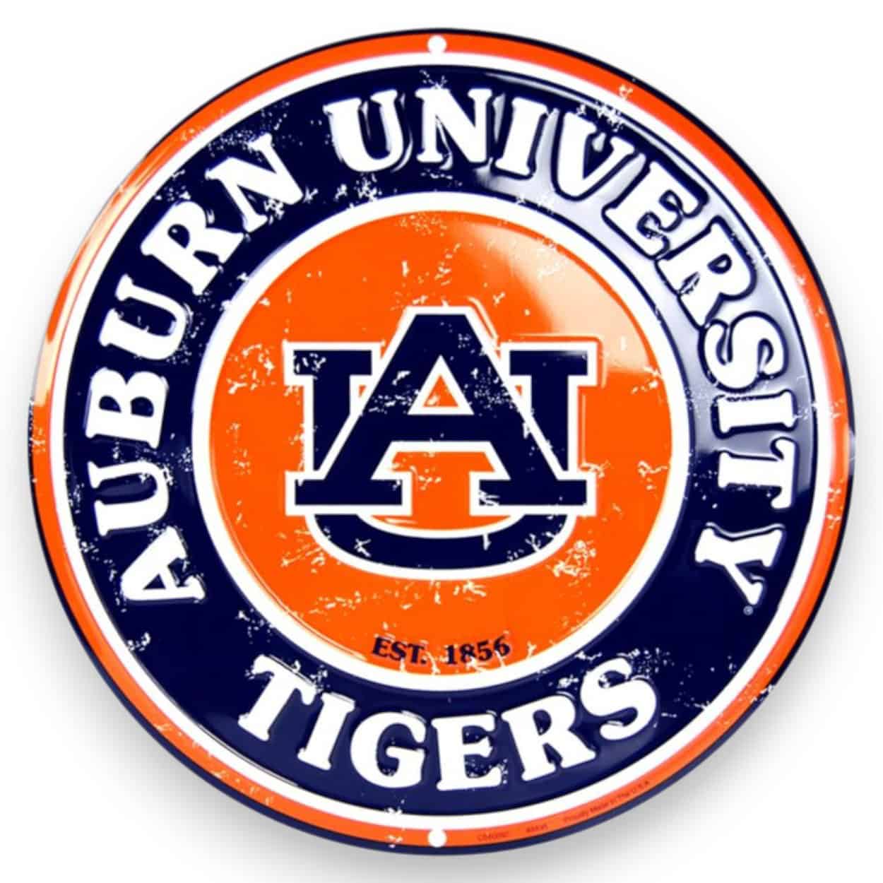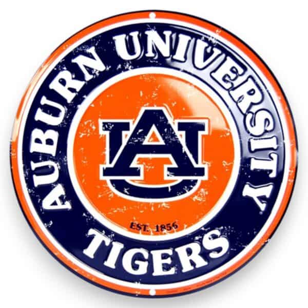 Show your spirit with this officially licensed NCAA Auburn Tigers Round Metal Sign—a bold, weather-ready accent for game-day decor and DIY wreaths. This round sign features Auburn University logo and team colors in a rustic distressed design. Made from lightweight, weather-resistant embossed aluminum, it measures 12″ round and includes predrilled holes at 6 and 12 o’clock for easy mounting. Made in the USA, this Auburn Tigers Round Metal Sign is perfect for Tigers wreaths, front porch or garage decor, tailgate setups, man cave displays, or as a fan gift.