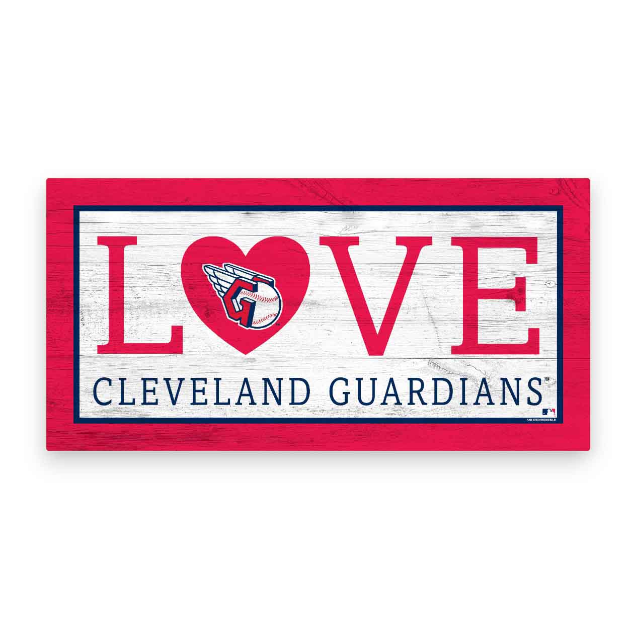 Show your team spirit with this officially licensed MLB Cleveland Guardians Love Sign! Our Cleveland Guardians Love Sign is decorated with the team logos and colors as a distressed design to mimic the look of rustic wood. The sign base is MDF wood and includes an attached twine hanger. This wood baseball sign is made in the USA and measures 12″ x 6″. The sports sign can be used as a wreath accent sign, home decor or a gift for that special Guardians baseball fan.