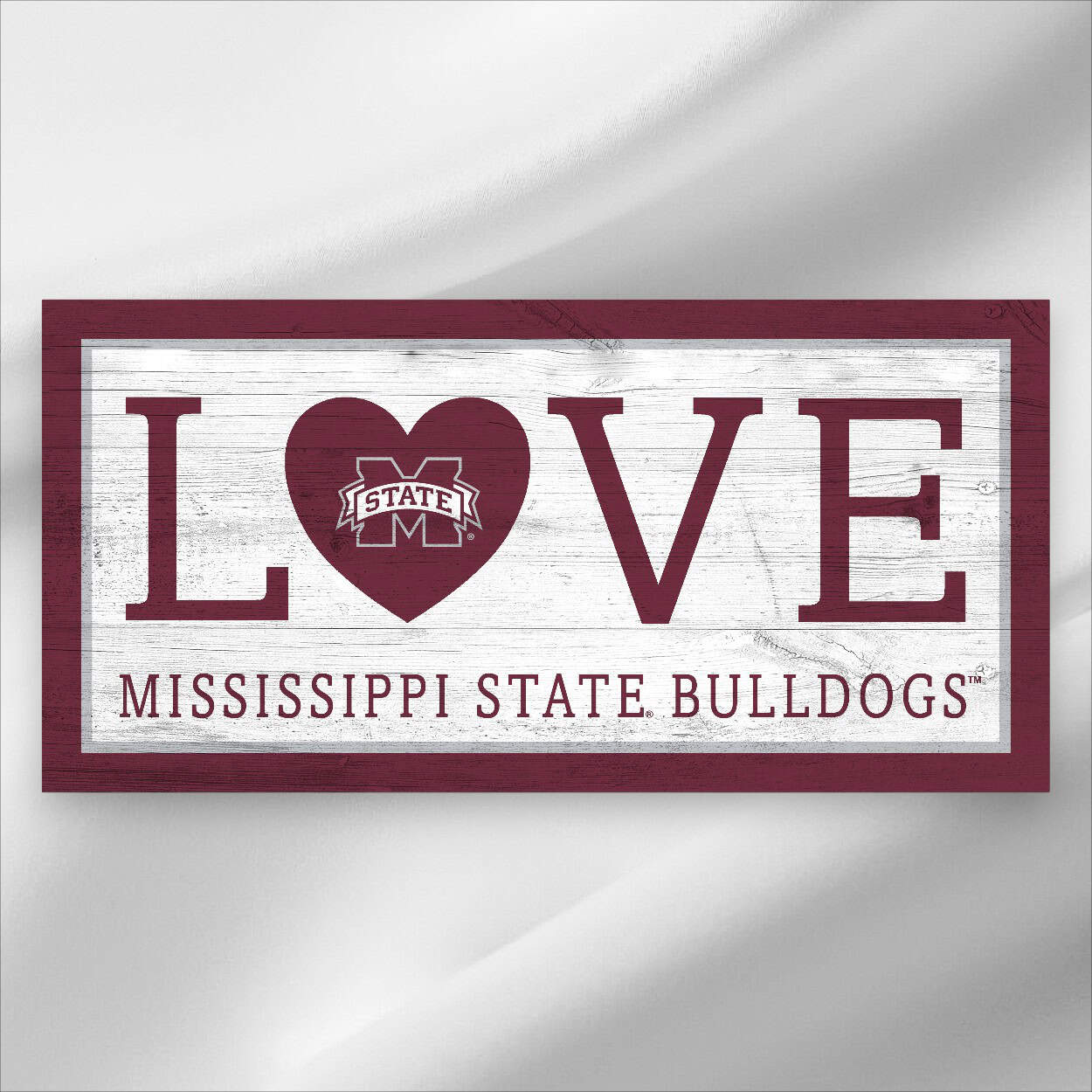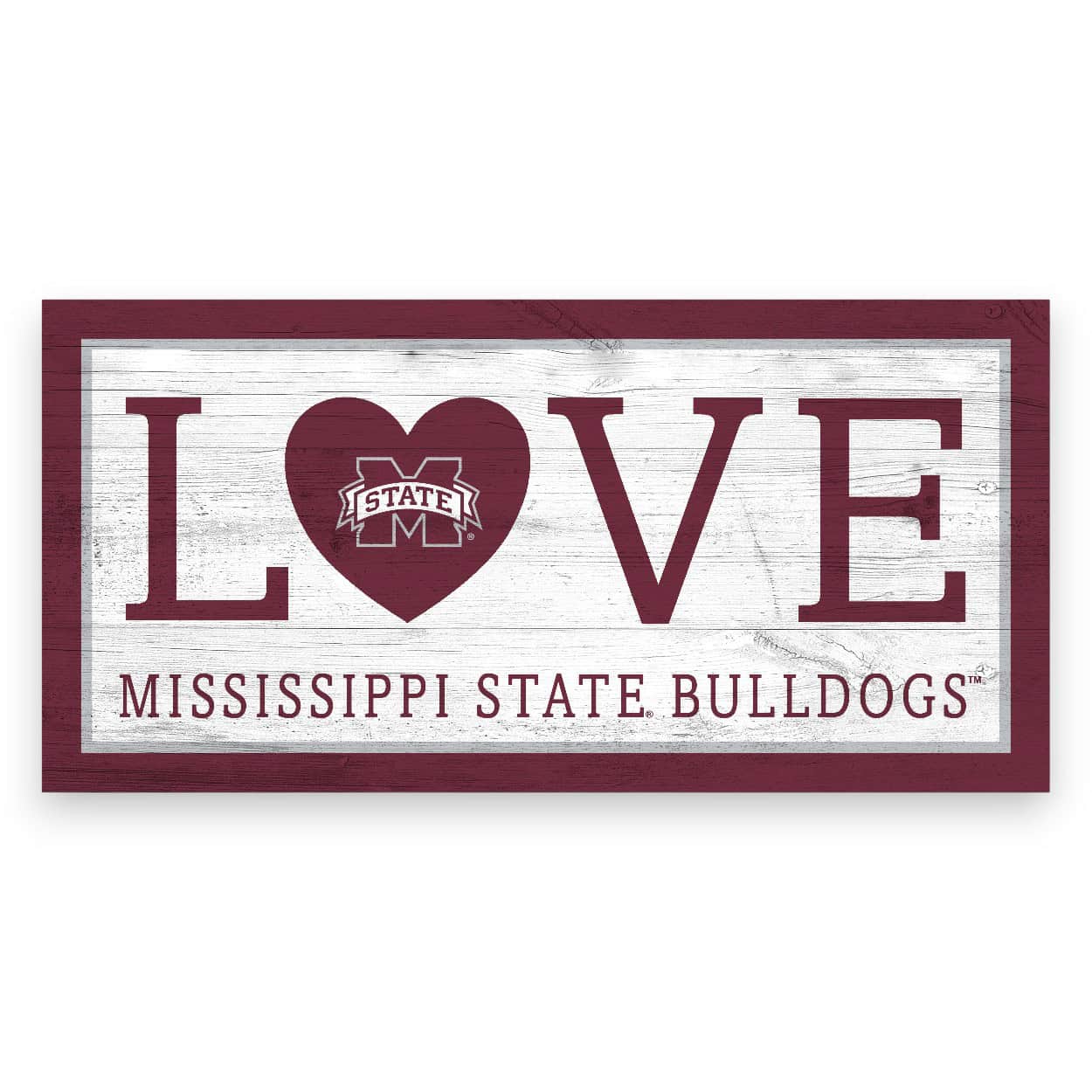 Show your spirit with this officially licensed NCAA Mississippi State Love Sign—a charming accent for wreaths, front doors, and game-day home decor. Featuring Mississippi State University logo and colors, this design has a rustic distressed wood look, with the image printed directly on MDF for a clean, durable finish. The sign includes an attached twine hanger for easy display. Made in the USA, this Mississippi State Love Sign measures 12″ x 6″. Use it as a wreath accent sign, front door or wall decor, tailgate decor, or a thoughtful gift for any Bulldogs fan.