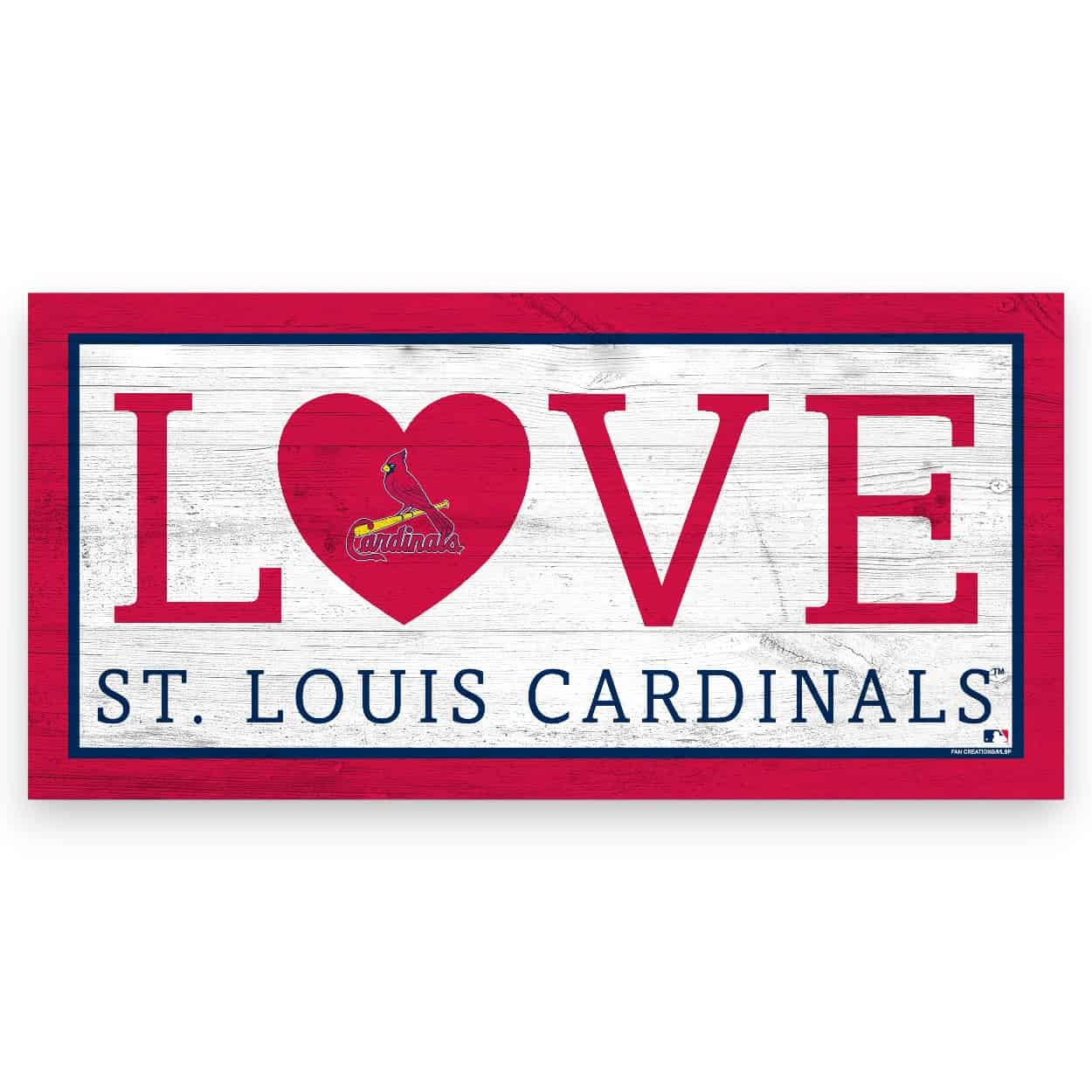 Show your team spirit with this officially licensed MLB St Louis Cardinals Love Sign!  Our St Louis Cardinals Love Sign is decorated with the team logos and colors as a distressed design to mimic the look of rustic wood.  The sign base is MDF wood and includes an attached twine hanger.  This wood baseball sign is made in the USA and measures 12″ x 6″.  The sports sign can be used as a wreath accent sign, home decor or a gift for that special Cardinals baseball fan.