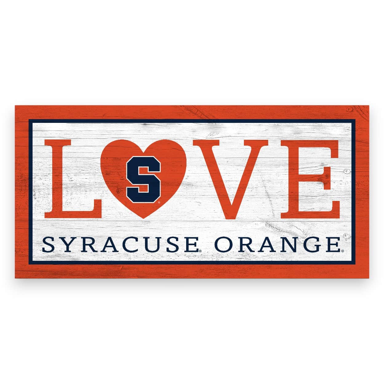 Show your spirit with this officially licensed NCAA Syracuse Love Sign—a charming accent for wreaths, front doors, and game-day home decor. Featuring Syracuse University logo and colors, this design has a rustic distressed wood look, with the image printed directly on MDF for a clean, durable finish. The sign includes an attached twine hanger for easy display. Made in the USA, this Syracuse Love Sign measures 12″ x 6″. Use it as a wreath accent sign, front door or wall decor, tailgate decor, or a thoughtful gift for any Orange fan.