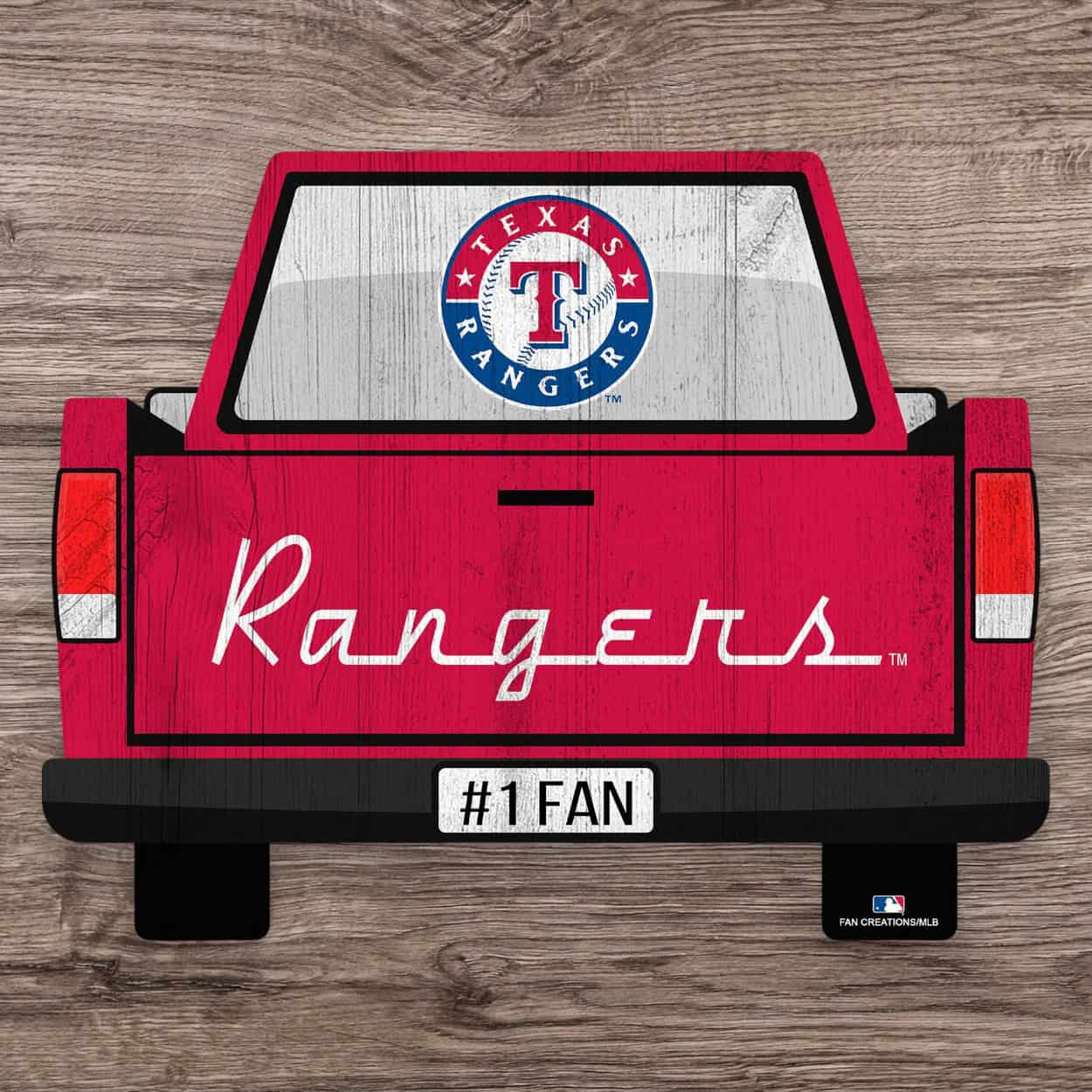 Show your spirit with this officially licensed MLB Texas Rangers Tailgate Sign. Our Texas Rangers Tailgate Sign is decorated to look like the back end of a sporty pickup truck. The back window is decorated with the Texas Rangers logo, the tailgate with the text “Rangers” and the license plate with the text “#1 Fan”. This is a distressed design to mimic the look of rustic wood and measures 12″ x 9.5″ x .25″. The sign base is MDF wood and made in the USA. The design is printed directly onto the wood (this is not an adhesive sticker) and includes a sawtooth hanger. Just perfect as a wreath accent sign, sports craft supply, home decor, or a gift for that special Rangers baseball fan.