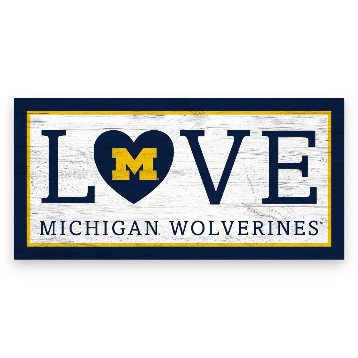 Show your spirit with this officially licensed NCAA Michigan Wolverines Love Sign! Our Michigan Wolverines Love Sign is decorated with the school logo and colors. It is a distressed design to mimic the look of rustic wood. The sign base is MDF wood and includes an attached twine hanger. The image is directly printed onto the sign. This collegiate sign is made in the USA and measures 12″ x 6″. The sports sign can be used as a wreath accent sign, home decor or a gift for that special sports fan.