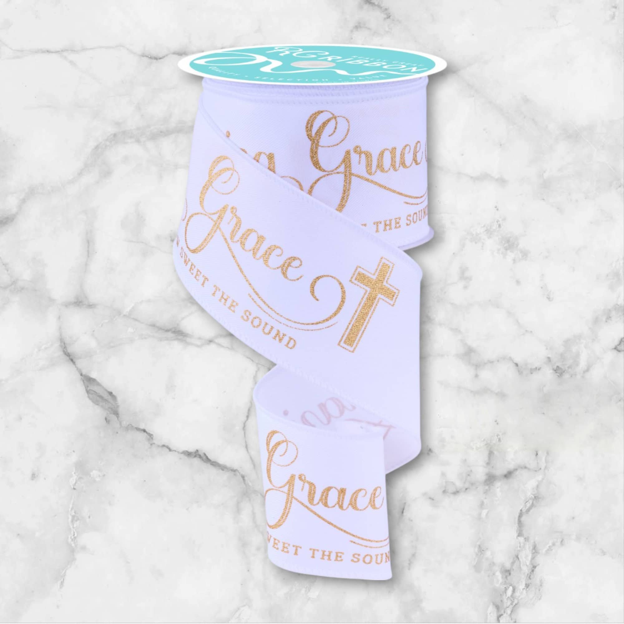 Our Gold Amazing Grace Ribbon is wonderful for all sorts of ribbon crafts, especially wreath making! This polyester ribbon features the glitter gold colored text “Amazing Grace, How Sweet the Sound” on a white background with a cross. It measures 2.5 inches wide by 10 yards for a total of 30 feet and includes with a white wired edge. So beatutiful for wreaths and bows. Â
