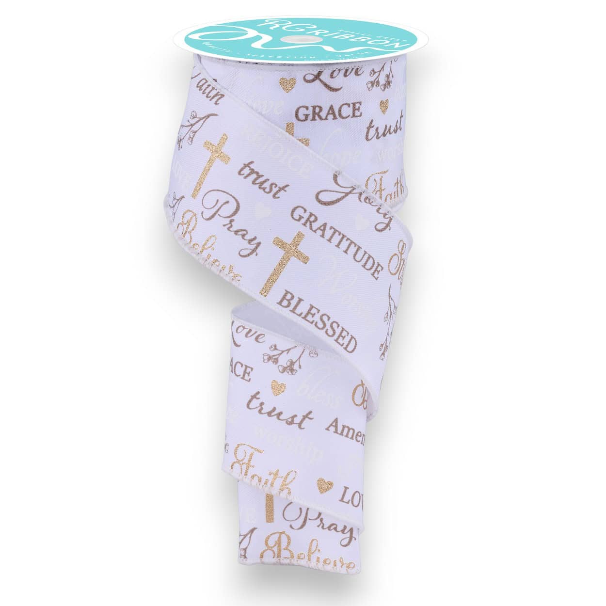 Our Faith Easter Ribbon is perfect for wreaths and crafts. The ribbon features various words of faith in gold and taupe on a white background accented with crosses. Areas of the ribbon in gold color are coated with glitter. The ribbon is made of polyester, has a white wired edge, and measures 2.5 inches x 10 yards (30 feet). Perfect for an Easter wreath or floral arrangment. Â