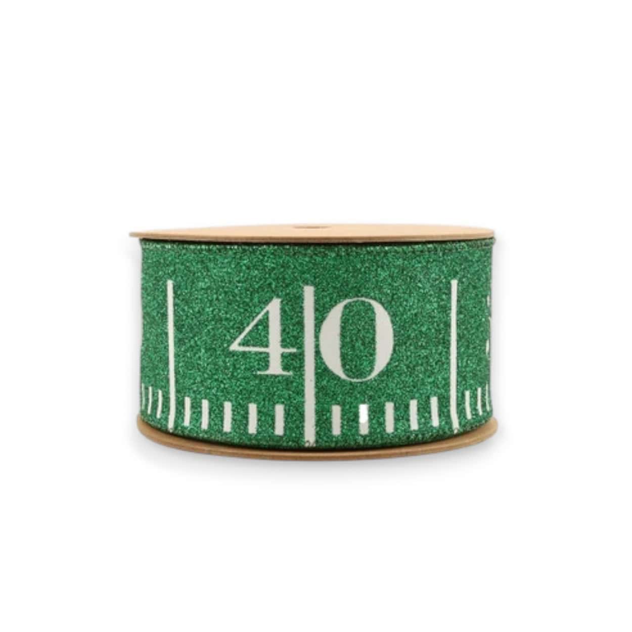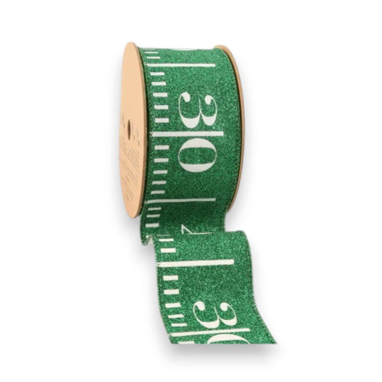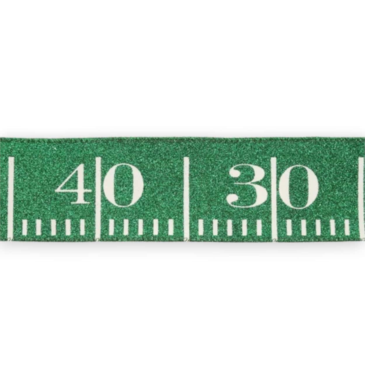 Our glitter green football ribbon is perfect for your fall craft projects. This ribbon mimics a football field with white lines on a green glitter background. The ribbon measures 2.5 inches wide by 10 yards for a total of 30 feet. It is made of polyester and has a green wired edge.
