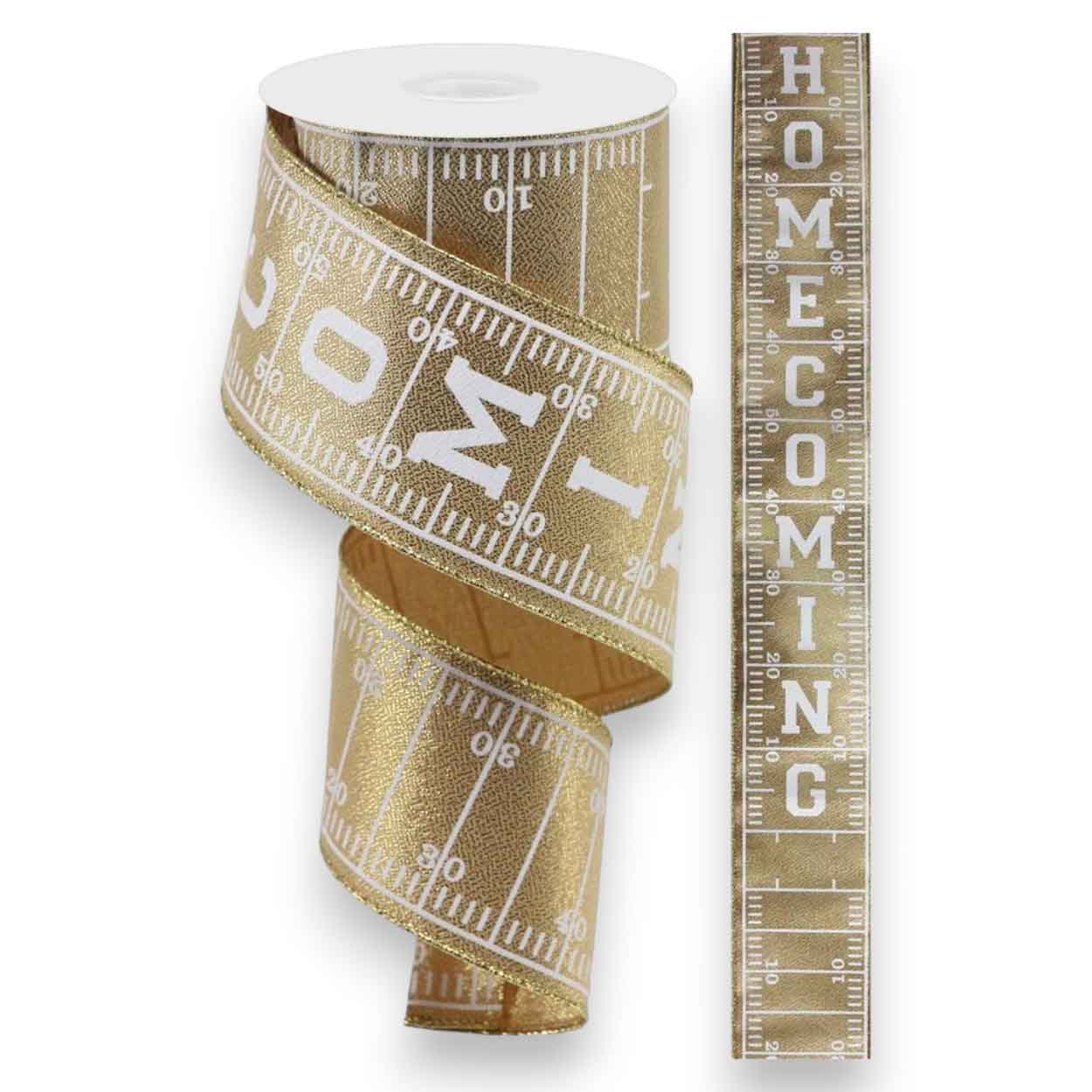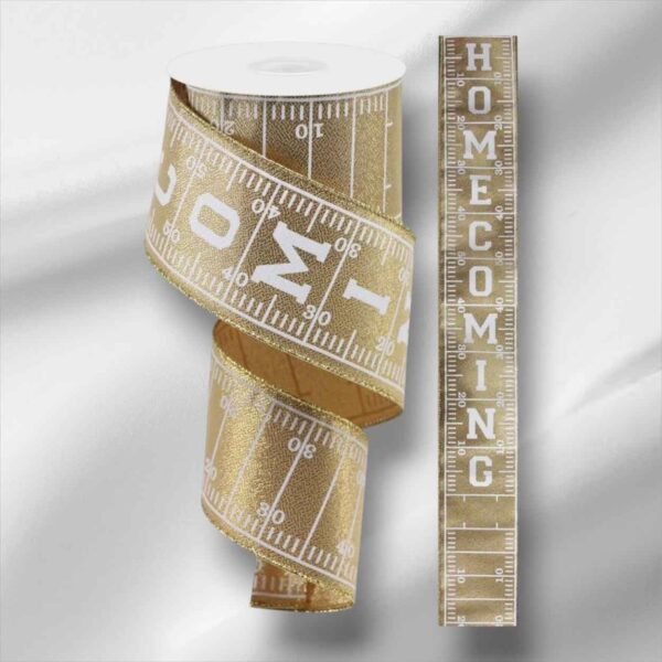 Our Gold Homecoming Football Ribbon is wonderful for all sorts of ribbon crafts, especially wreath making! This ribbon features the white block text “Homecoming” on a gold colored football field. The ribbon measures 2.5 inches wide by 10 yards for a total of 30 feet and is made of 50% Metallic / 50% Polyester. So perfect for wreaths, bows, gifts and crafts.FAQs
