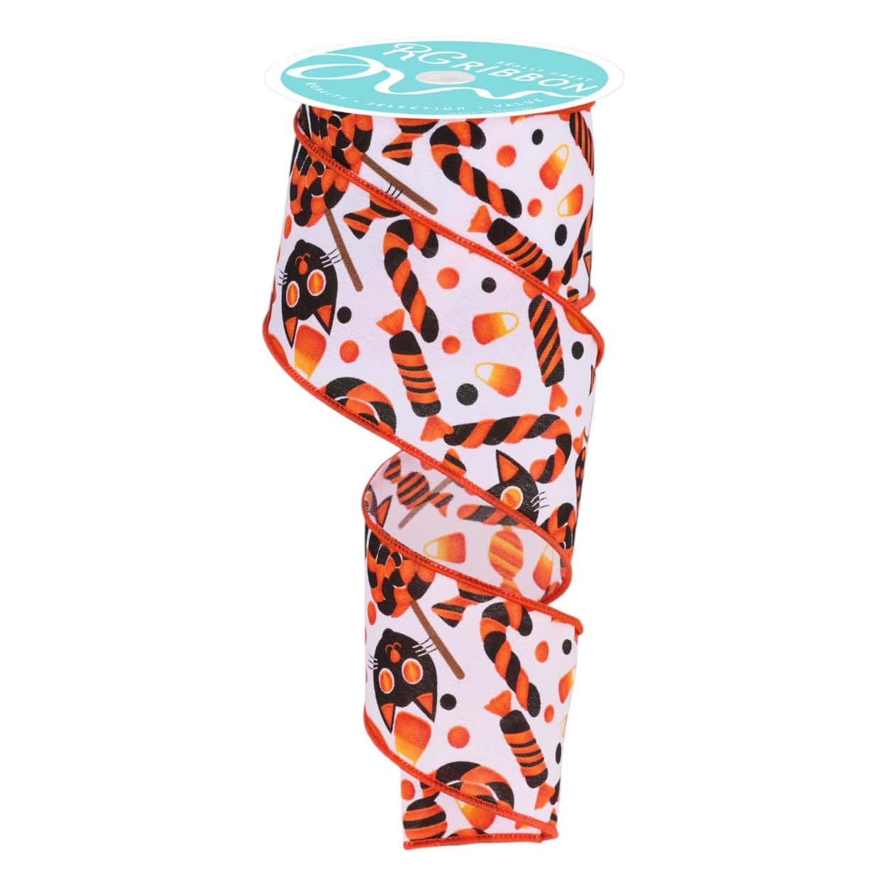 Our Halloween Candy Ribbon is so cute! The ribbon features assorted Halloween candy, along with pumpkins and black cats on a white background. The ribbon measures 2.5″ wide x 10 yards for a total of 30 feet. The Halloween ribbon is made of polyester and has an orange wired edge. Perfect for Halloween wreaths and craft projects!