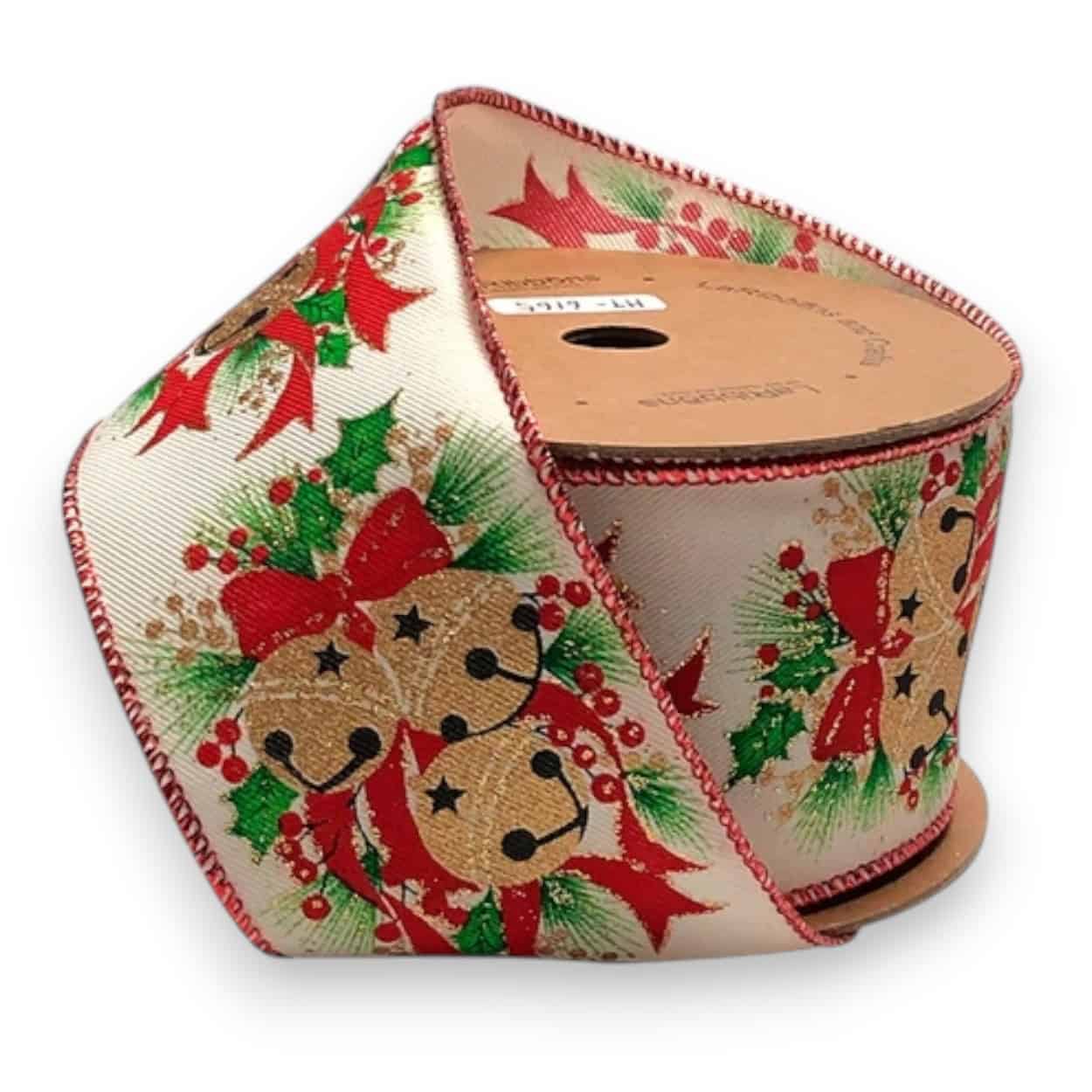 Our Holiday Bells Ribbon is wonderful for all sorts of ribbon crafts, especially wreath making! This ribbon is decorated with glitter covered gold bells with holly on a white background. Areas of the ribbon in gold color are coated with glitter. The ribbon is made of polyester and has a metallic red wired edge. The Christmas ribbon measures 2.5 inches wide by 10 yards for a total of 30 feet. Perfect for your holiday wreaths, bows and crafts!