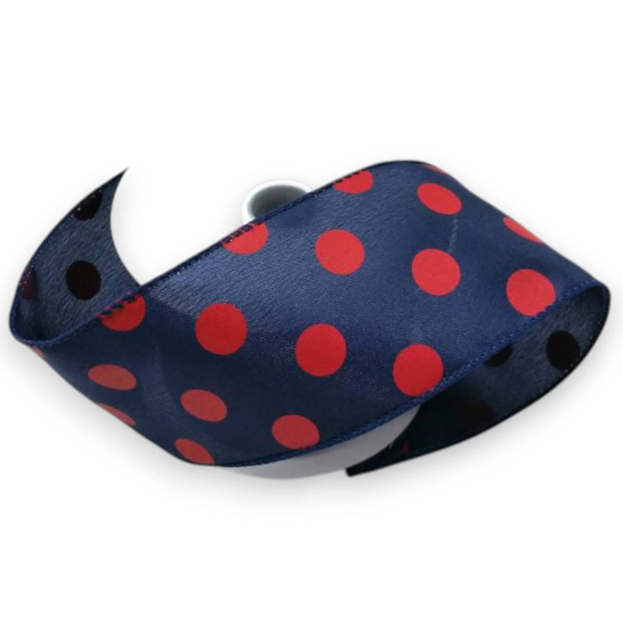 Our Navy Red Polka Dot Ribbon is wonderful for all sorts of ribbon crafts, especially wreath making! This ribbon features red polka dots on a navy background. The satin ribbon measures 2.5 inches wide by 10 yards for a total of 30 feet and includes a navy wired edge. Just perfect for your wreaths and craft projects. Â