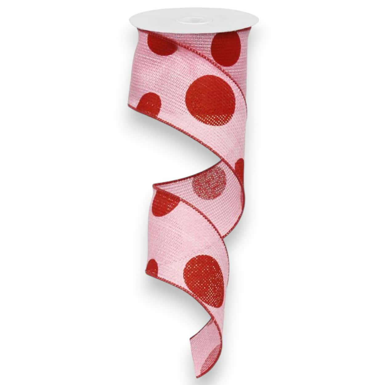 Our Pink Red Polka Dot Ribbon is wonderful for all sorts of ribbon crafts, especially wreath making! This pink colored ribbon with red polka dots measures 2.5 inches wide by 10 yards for a total of 30 feet. The faux woven burlap ribbon is made of polyester and has a red wired edge. Perfect for wreaths, bows, gifts and crafts.