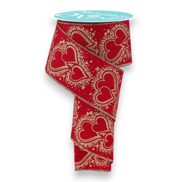 Our Gold Red Heart Ribbon is so elegant. This polyester Valentine ribbon measures 2.5 inches wide by 10 yards for a total of 30 feet and includes a wired edge. Just perfect for your Valentine’s Day wreaths, bows and decorations. Â