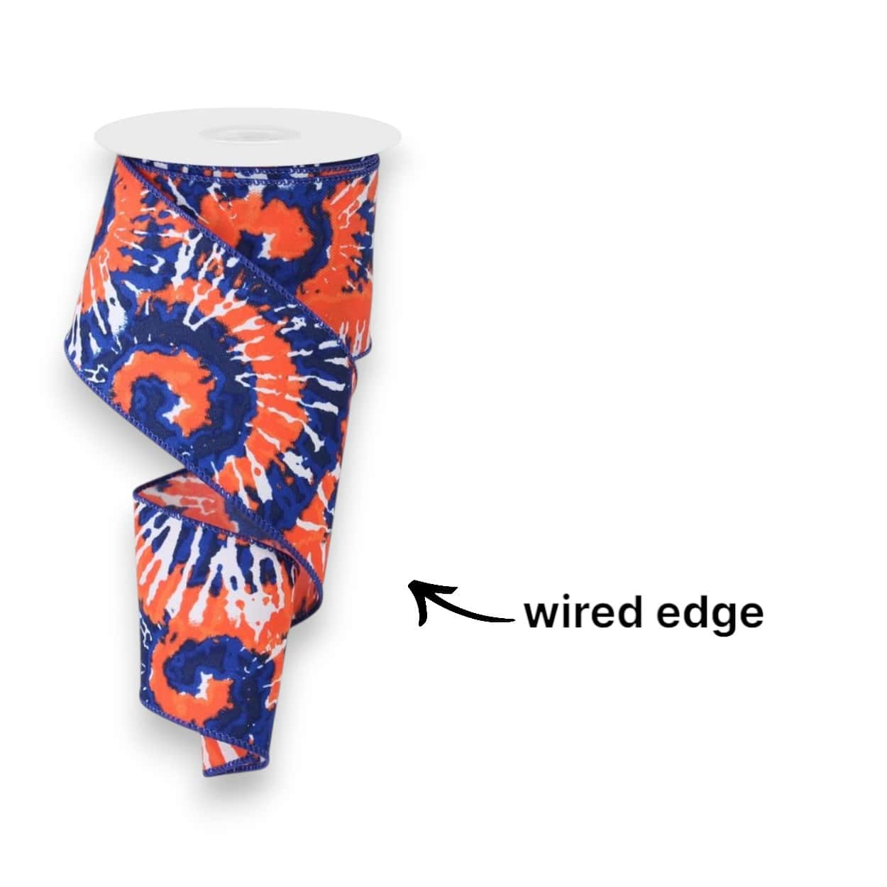 Our Navy Orange Tie Dye Ribbon is wonderful for all sorts of ribbon crafts, especially wreath making! This polyester ribbon looks like its been tie dyed for a really fun effect. The navy and orange ribbon measures 2.5 inches wide by 10 yards for a total of 30 feet and includes a blue wired edge. Perfect for football wreaths, flower arrangements, gifts and craft projects.FAQs
