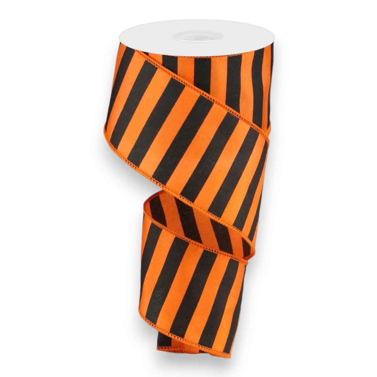 Our orange black stripe ribbon is wonderful for all sorts of ribbon crafts, especially wreath making! This orange and black ribbon measures 2.5 inches wide by 10 yards for a total of 30 feet. The fabric ribbon is made of satin and has a wired edge. Perfect for wreaths, bows and craft projects.FAQs