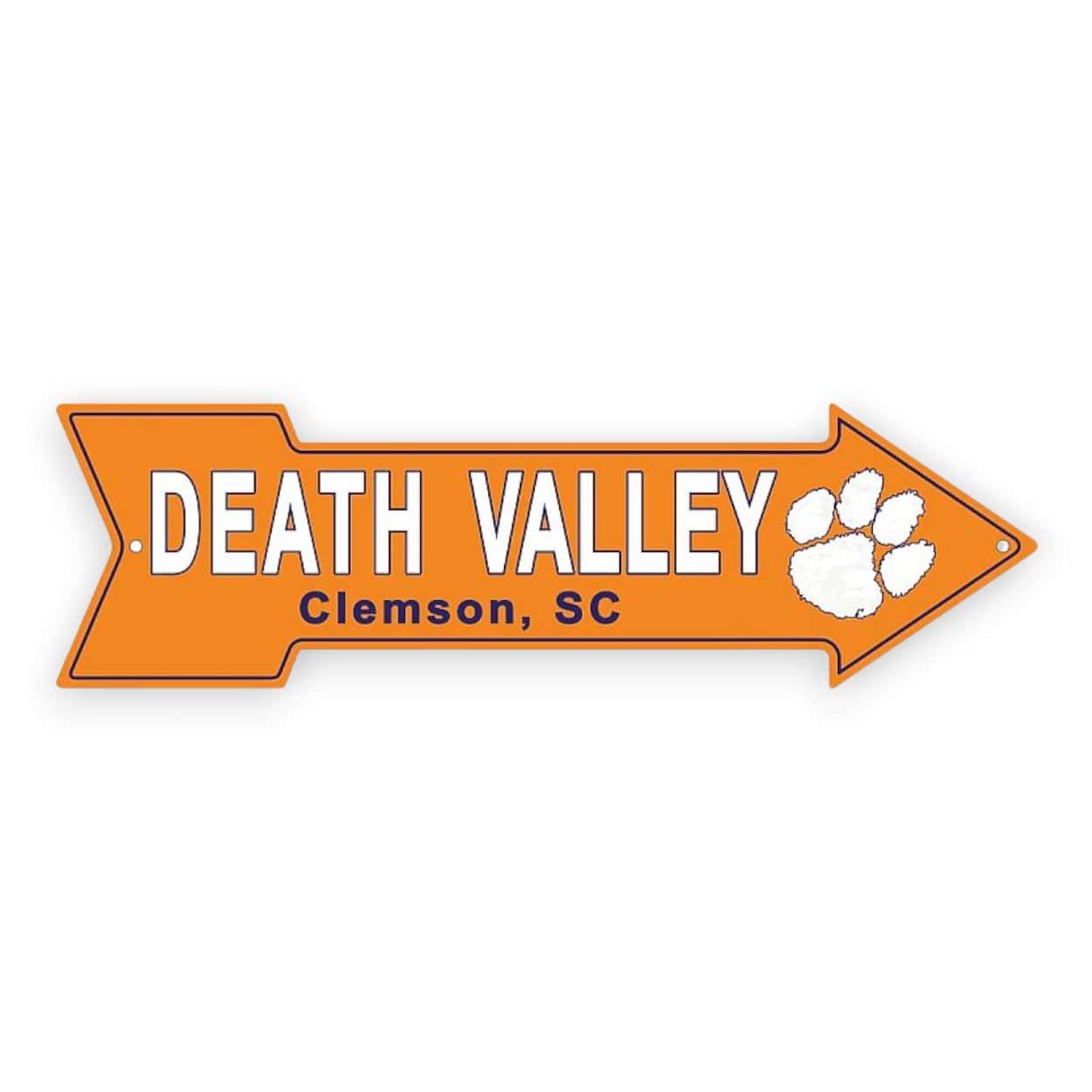 Show your spirit with this Clemson Arrow Sign! The sign features the text “Death Valley, Clemson, SC” on a metal arrow with the Clemson University logo and colors. The lightweight arrow sign measures 5.75″ x 20″, is made of weather resistant embossed aluminum and includes predrilled holes for easy mounting. Made in the USA. Just perfect for your Clemson wreaths, decor and fan gifts.