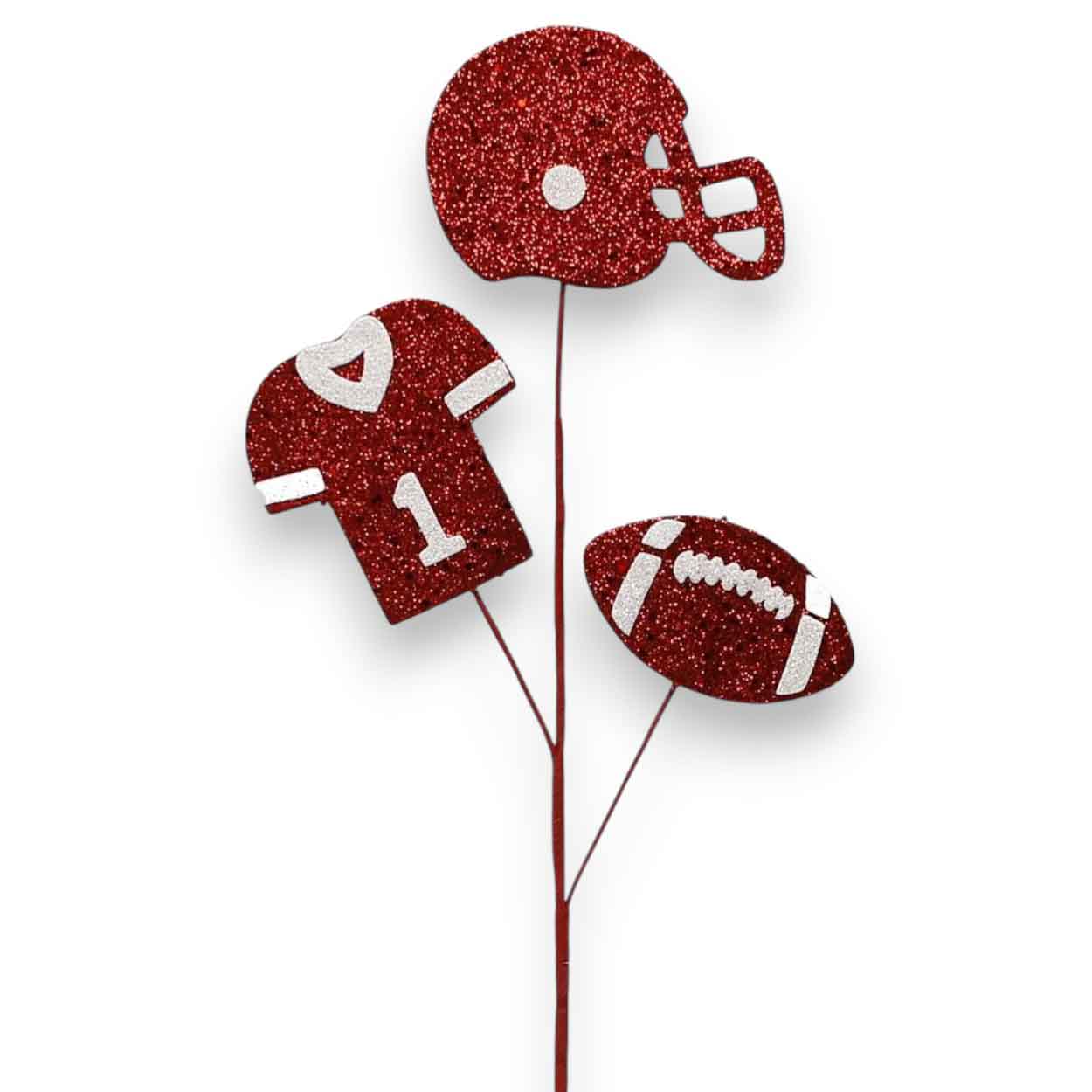 Our 24″ Red White Football Pick is perfect for wreath accents and football craft projects. This flat red and white glittered football pick features a helmet, football and a jersey, each 5″ wide on a red wired stem. Just perfect for your football wreaths, floral projects and party decorations.FAQs