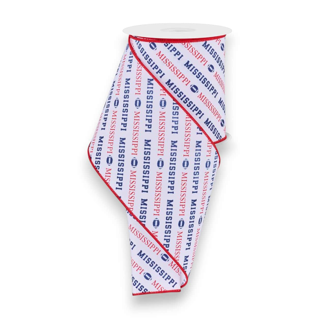 Our Ole Miss Diagonal Text Ribbon is perfect for wreath making and craft projects! This ribbon features the text “Mississippi” in red and navy on a white background. The ribbon is made of polyester and includes a crimson colored wired edge. Just awesome for your Ole Miss football wreath, bows and party decorations!