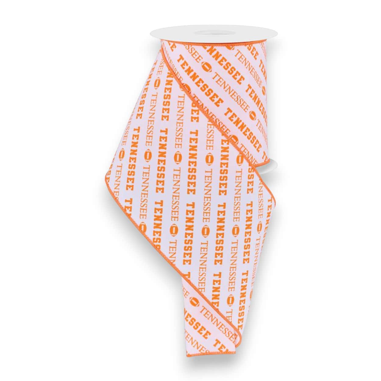 Add bold team style to your designs with Tennessee Diagonal Text Ribbon—perfect for wreath making, bows, and party decorations. Featuring the text “Tennessee” in orange on a white background, this ribbon measures 4″ x 10 yards (30 feet), is made of polyester, and includes an orange wired edge for easy shaping. This Tennessee Diagonal Text Ribbon is a great choice for Tennessee Vols football wreaths and game-day craft projects.