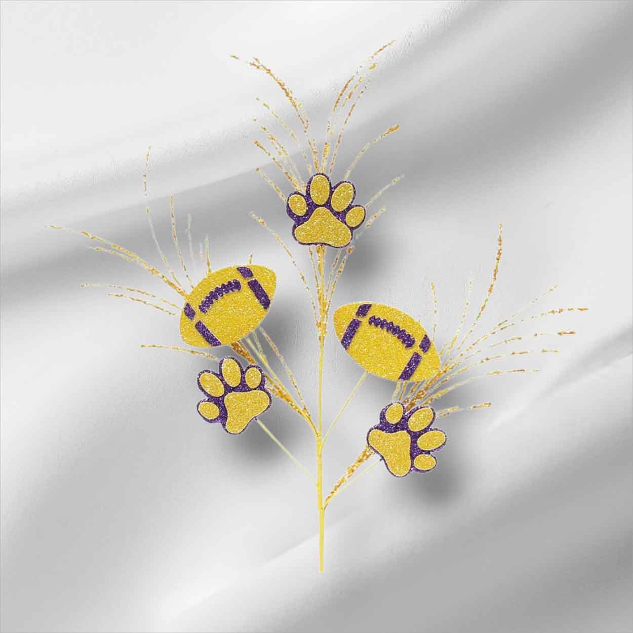 Add team spirit with Yellow LSU Football Pick—a festive accent featuring glitter-covered styrofoam footballs with bold tiger print details on a yellow wired stem. The wired stem makes it easy to bend, shape, and tuck into wreaths and arrangements. Use Yellow LSU Football Pick for football wreaths, floral projects, and party decorations.