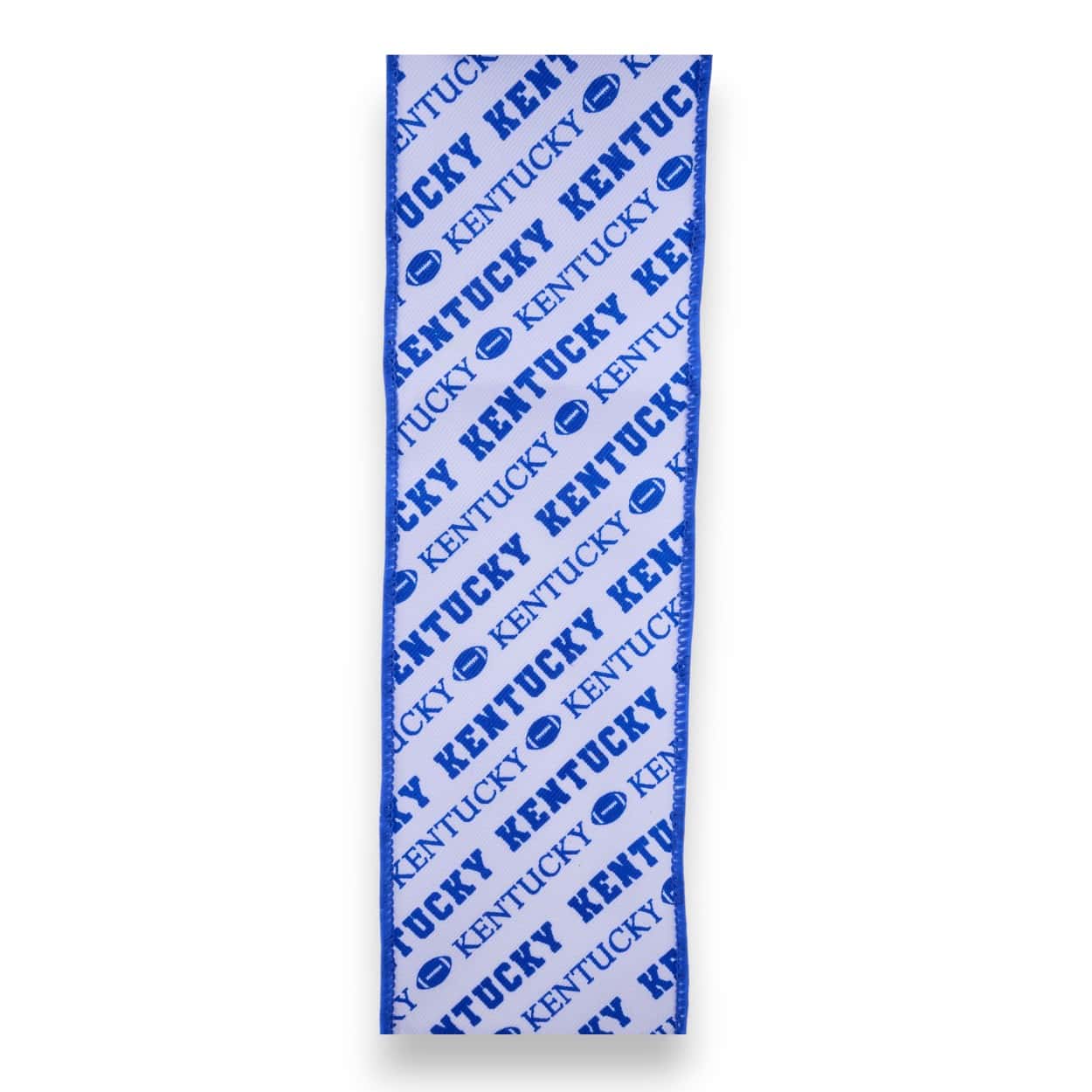 Our Kentucky Diagonal Text Ribbon is perfect for wreath making and craft projects! This ribbon features the text “Kentucky” in blue on a white background. The ribbon is made of polyester and includes a blue wired edge. It measures 4 inches wide by 10 yards long for a total of 30 feet. Just awesome for your Kentucky wreaths, bows and party decorations!