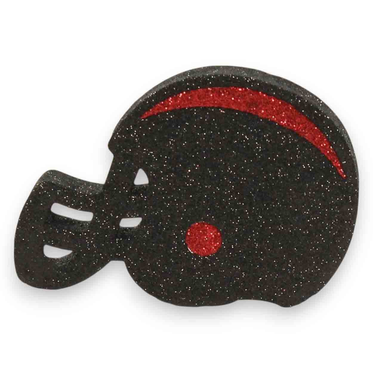 Add sparkle to your game-day and holiday projects with this Black Red Flat Football Helmet Ornament—perfect for football wreaths, craft projects, tree décor, gift tags, and fan gifting. This helmet ornament features black and red glitter on the front with coordinating glitter on the sides for extra shine from every angle. The design is on the front side only, and it is flat (NOT 3D). Made from glitter-covered foam, it includes an attached clear loop hanger for easy hanging on wreaths, trees, garlands, or gift packages. This Black Red Flat Football Helmet Ornament is a fun finishing touch for football-themed décor and gifts.