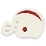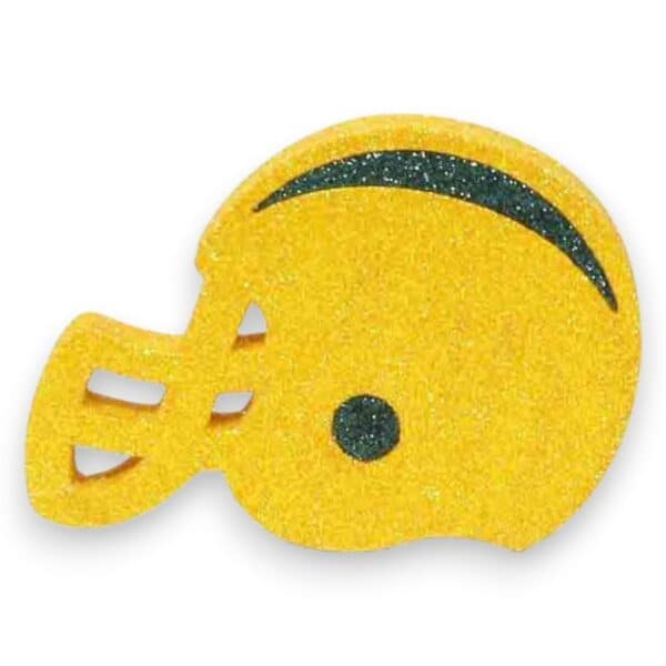 Our Yellow Green Flat Football Helmet Ornament features yellow and green glitter on the front of the ornament and yellow glitter on the sides. The design is on the front side only. This ornament is ***NOT 3D**. It is flat. The Yellow Green Flat Football Helmet Ornament measures 5″ wide x 3.5″ tall x 5/8″ thick, is made of glitter covered foam, and includes an attached clear loop for hanging. Just perfect for football wreaths, craft projects, your Christmas tree, gift tags or as a gift for that special football fan.