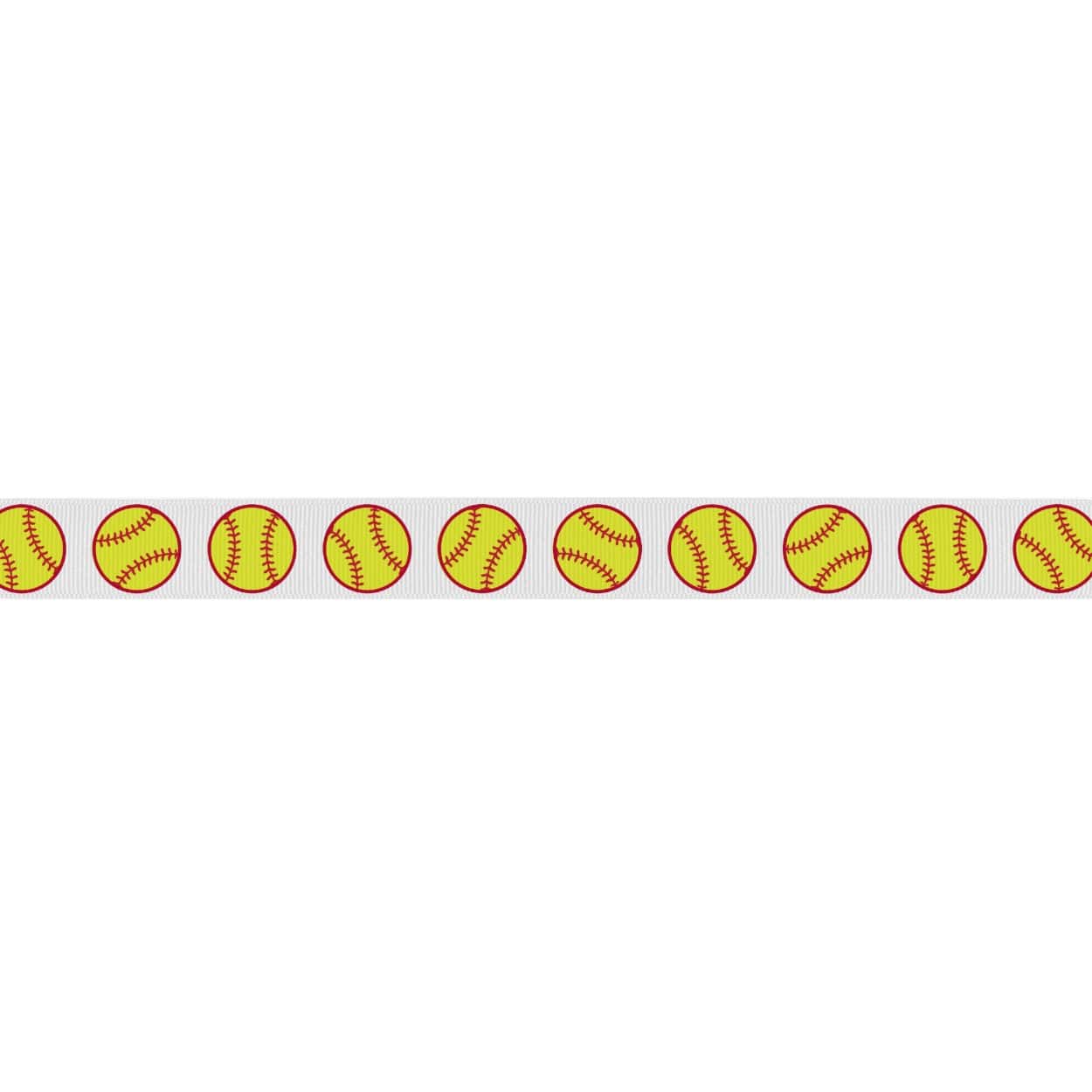 Our Grosgrain Softball Ribbon features repeating softballs in different directions on a white background. This unwired ribbon measures 7/8 inches x 25 yards and is made of polyester. Grosgrain ribbon is a sturdy, ribbed ribbon with horizontal ridges, making it perfect for bows, hair accessories, gift wrapping, floral arrangements, and many other craft projects. Â