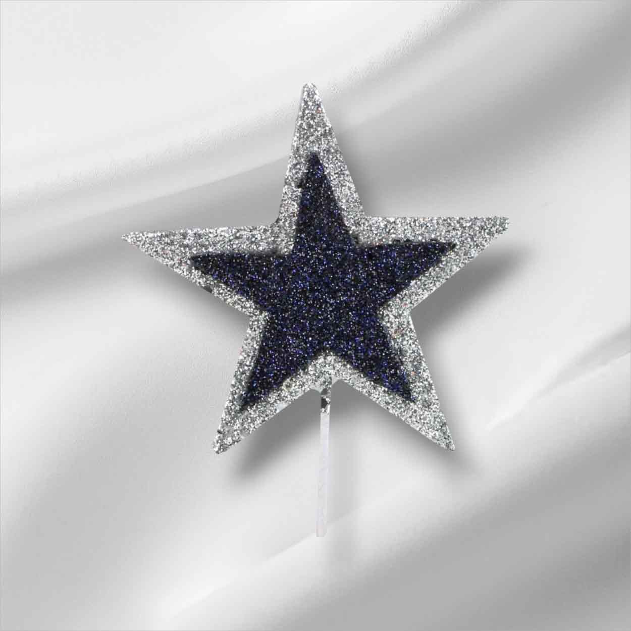 Our Dallas Cowboys pick is perfect for your wreath accents, floral centerpieces and craft projects. This Dallas Cowboys pick measures 8″ inches high by 3.75″ wide. It is made a foam and comes on a wired pick covered in white paper. The star has a glitter navy center surrounded by a glitter silver. Perfect for your Cowboys wreaths, centerpieces, crafts and party decorations!FAQs