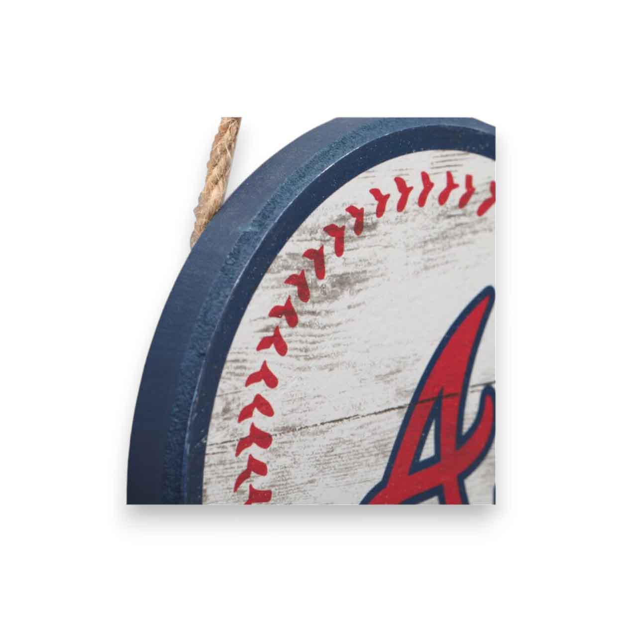 Cheer on your team with our Atlanta Braves Ornament! This officially licensed MLB ornament features the team logo and colors in a distressed design. The Christmas ornament measures 4″ W X 4″ H X 0.375″ D and is made in the USA. It is made of wood and features an attached twine hanger. The design shown in on the front of the ornament, while the back of the ornament is plain wood. This Atlanta Braves Baseball Ornament is perfect for wreaths, Christmas trees, home decor and gifts for that special MLB Braves fan.FAQs
