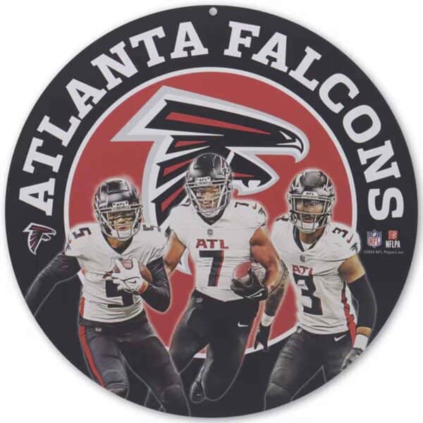 Cheer on your team with our Atlanta Falcons Players Sign! This officially licensed NFL sign features the team logo, colors and a trio of your favorite players. This sign is also officially licensed by the NFLPA. Our round sign measures 10.75″ W X 10.75″ H X 0.125″ D and weighs 0.4 lbs. It is made in the USA of rust free, weather-resistant aluminum. The football sign is smooth to the touch on both sides. The sign includes a small pre-punched hole at 12 o’clock for easy hanging. This Atlanta Falcons Players Sign is perfect for your ATL Falcons football wreaths, home decor, tailgate parties and fan gifts!