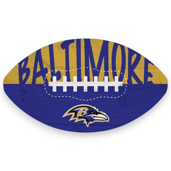 Our Baltimore Ravens Color Football Sign features a football decorated in the team logo and colors. This officially licensed NFL Baltimore Ravens Color Football Sign is a distressed design printed directly on MDF wood. The football sign is made in the USA, measures 12″ x 7″ x .25″ and includes an attached hanger. This sign is perfect for a wreath, home decor, party decor or a gift for that special football fan.FAQs