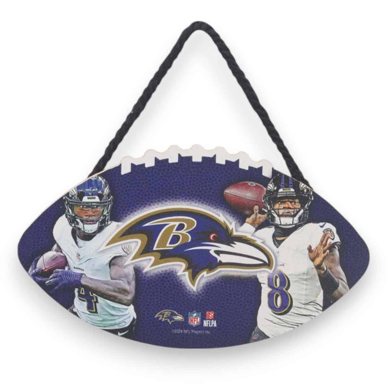 Cheer on your team with our Baltimore Ravens Players Ornament! This officially licensed NFL ornament features the team logo, colors and two of your favorite players. The ornament is also officially licensed by the NFLPA.  The Christmas ornament measures 5.625″ W X 3.75″ H X 0.25″ D and is made in the USA.  It is made of wood and features an attached black hanger.  The ornament  is in the shape of a football and is die cut at the top laces.  The design shown in on the front of the ornament, while the sides and back are plain wood.  This Baltimore Ravens Players Ornament is perfect for wreaths, Christmas trees, home decor and gifts for that special football fan.