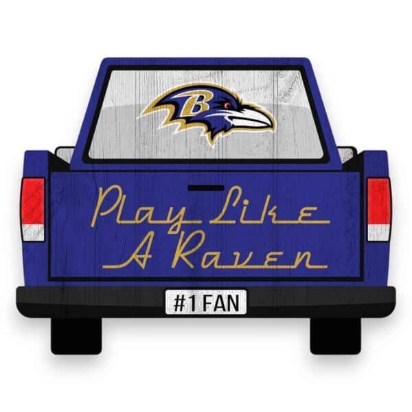 Show your spirit with this officially licensed NFL Baltimore Ravens Tailgate Sign! Our sign is decorated to look like the back end of a sporty pickup truck. The football sign is decorated with team logo, colors and slogan. This is a distressed design to mimic the look of rustic wood and measures 12″ x 9.5″ x .25″. The sign base is MDF wood and made in the USA. The design is printed directly onto the wood (this is not an adhesive sticker) and includes a sawtooth hanger. This Baltimore Ravens Tailgate Sign is perfect as a wreath accent sign, sports craft supply, home decor, party decor, or a gift for that special football fan.
