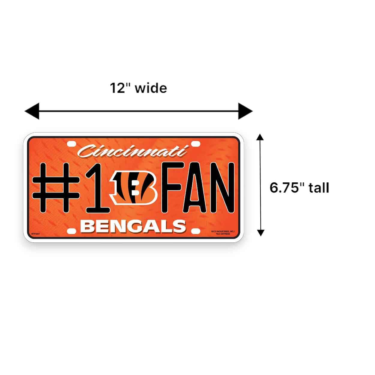 Our Bengals Fan License Plate is perfect for your wreaths, home decor, vehicles and gifts! The sign features the team colors, logo, and the text #1 Fan. This Bengals Fan License Plate measures 12″ wide x 6.75″ tall and is made of weather resistant embossed aluminum. It includes 4 pre-drilled holes for easy mounting. This sign is made in the USA and is an officially licensed product.FAQs