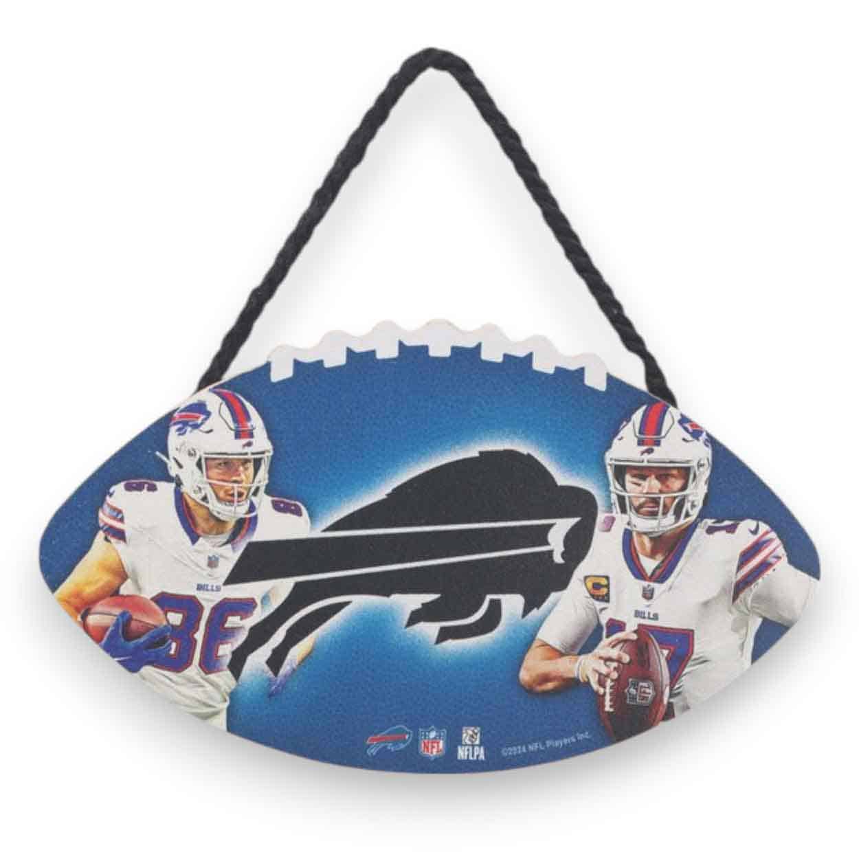Cheer on your team with our Buffalo Bills Players Ornament! This officially licensed NFL ornament features the team logo, colors and two of your favorite players. The ornament is also officially licensed by the NFLPA. The Christmas ornament measures 5.625″ W X 3.75″ H X 0.25″ D and is made in the USA. It is made of wood and features an attached black hanger. The ornament is in the shape of a football and is die cut at the top laces. The design shown in on the front of the ornament, while the sides and back are plain wood. This Buffalo Bills Players Ornament is perfect for wreaths, Christmas trees, home decor and gifts for that special Bills football fan.FAQs