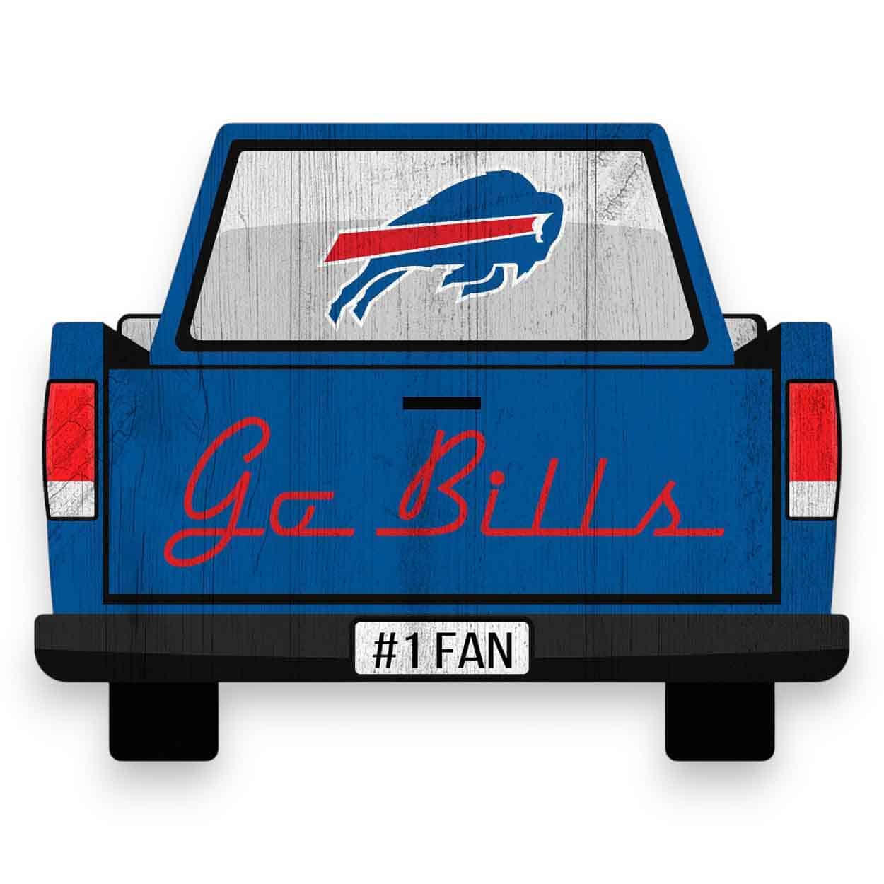 Show your spirit with this officially licensed NFL Buffalo Bills Tailgate Sign! Our sign is decorated to look like the back end of a sporty pickup truck. The football sign is decorated with team logo, colors and slogan. This is a distressed design to mimic the look of rustic wood and measures 12″ x 9.5″ x .25″. The sign base is MDF wood and made in the USA. The design is printed directly onto the wood (this is not an adhesive sticker) and includes a sawtooth hanger. This Buffalo Bills Tailgate Sign is perfect as a wreath accent sign, sports craft supply, home decor, party decor, or a gift for that special football fan.FAQs