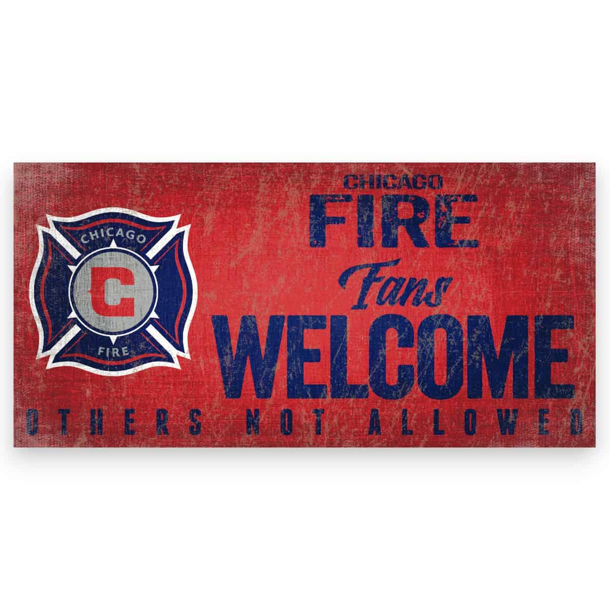Show your spirit with this officially licensed MLS Chicago Fire Fans Welcome Sign! Our sign is decorated with the team name, logo, colors and text “Fans Welcome, Others Not Allowed”. It is a distressed design to mimic the look of rustic wood. The image is printed directly on the sign base, made of MDF wood – this is not a printed paper decal. This sign is made in the USA and measures 12″ x 6″ x .25″ and includes an attached rope hanger. The Chicago Fire Fans Welcome Sign can be used as a wreath accent sign, home decor, mancave or a gift for that special soccer fan.