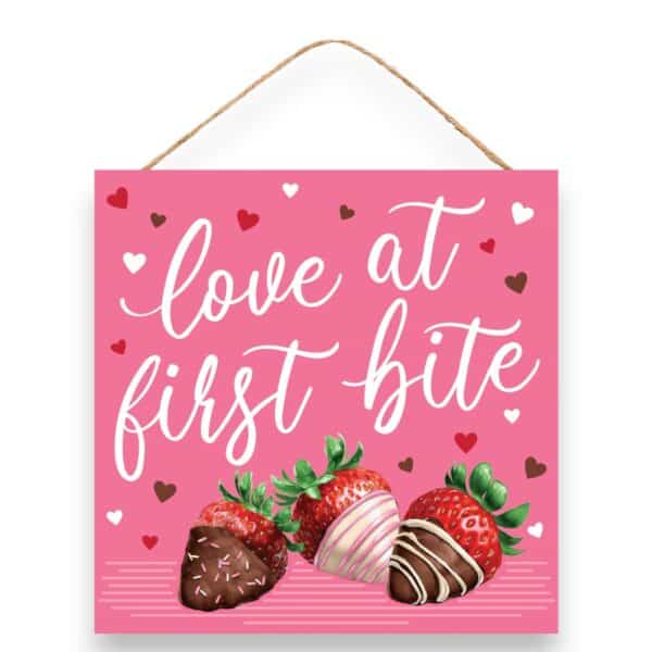 Decorate with our Chocolate Covered Strawberries Sign! This sign features 3 delicious chocolate covered strawberries with the text “love at first bite”. The sign is also decorated with different colored hearts – all on a pink background. The Valentine’s Day sign is made of printed paper on mdf, includes an attached twine hanger and measures 10″ x 10″ x .25″. Perfect for a Valentine’s Day wreath, home decor or a party decorations.