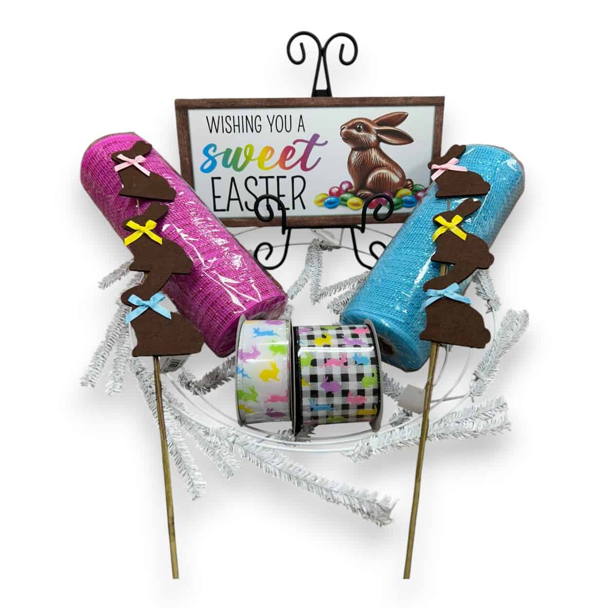Celebrate the holiday with our Chocolate Easter Bunny Wreath Kit! This 8-piece kit includes everything you need to make a beautiful 24″ Easter wreath! The kit includes our Sweet Easter Bunny Sign, 10″ Turquoise Metallic Deco Mesh, 10″ Hot Pink Metallic Deco Mesh, 2- Chocolate Bunny Easter Picks, 1.5″ Pastel Easter Bunny Ribbon, 2.5″ Buffalo Plaid Easter Bunny Ribbon, and a 15″ White Wire Wreath Frame. This curated bundle ensures your items will match perfectly and takes the guess work out of desigining your wreath. The bundle contents are fixed and pre-packed for lower prices and faster shipping. We hope you enjoy this Chocolate Easter Bunny Wreath Kit as much as we do!