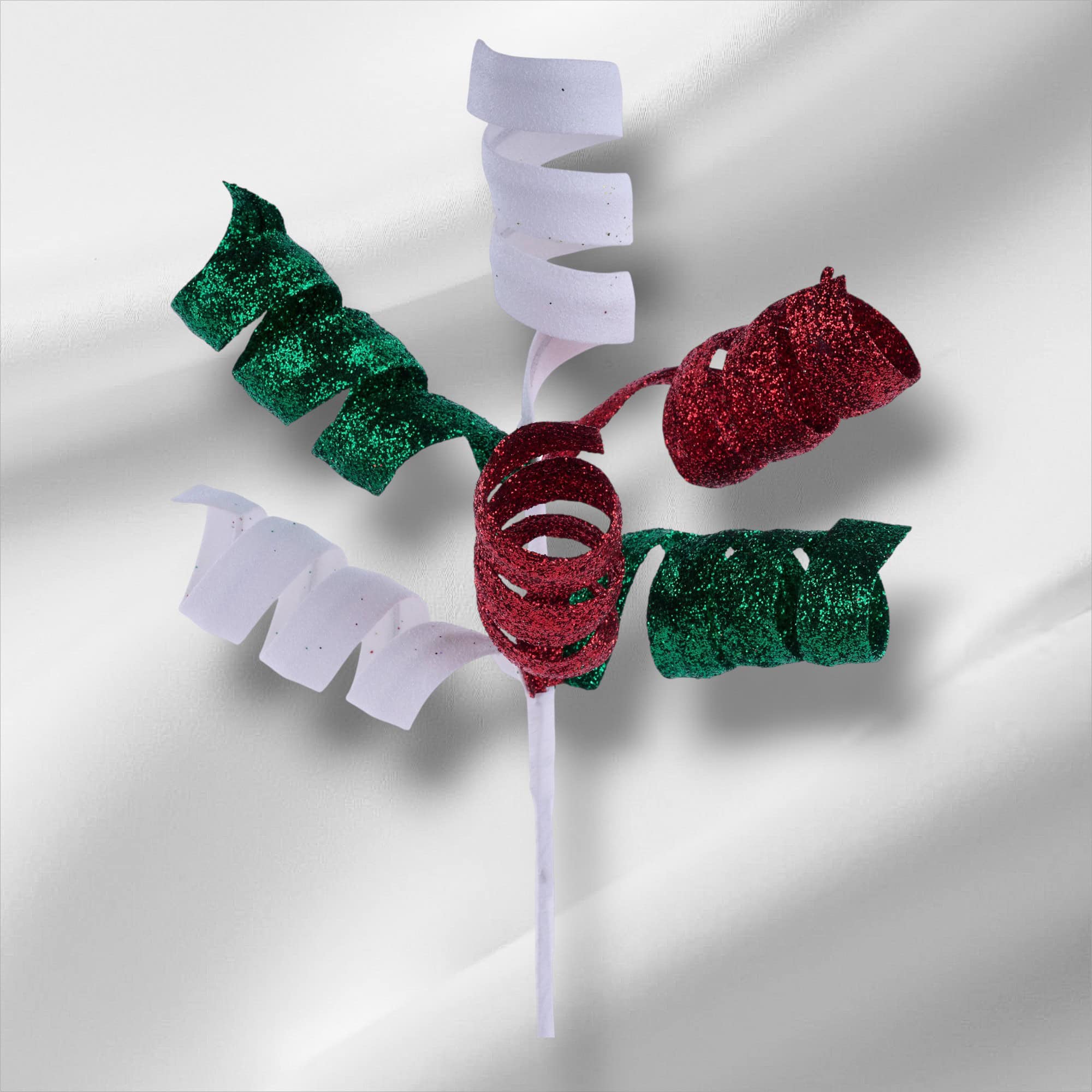 Add a playful pop of color and texture to your next project with our Christmas Curly Pick! This charming decorative accent is perfect for wreaths, floral arrangements, centerpieces, and a wide range of craft projects. Measuring 14 inches in length, our green, red and white pick features six individual curls made of lightweight foam and coated in shimmering glitter for a festive, eye-catching look. The wired stem is wrapped in white paper, making it easy to bend, shape, and secure wherever you need a touch of flair. Whether you’re crafting for the holidays, a special event, or simply adding some sparkle to your décor, this glitterly curly pick is a fun and versatile choice.