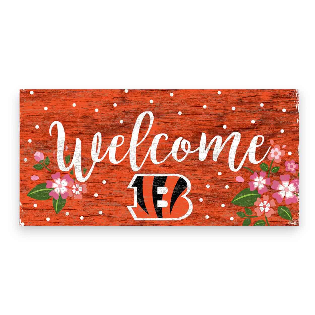 Show your spirit with this officially licensed NFL Cincinnati Bengals Flowers Sign! The football sign is decorated with the team logo, colors and “Welcome” in white script text. This cute sign is decorated with color-coordinating flowers and white polka dots. It is a distressed design to mimic the look of rustic wood. The image is printed directly onto MDF wood and the sign includes an attached twine hanger. This Cincinnati Bengals Flowers Sign is made in the USA and measures 12″ x 6″ x .25″. The sign can be used as a wreath accent sign, home decor, party decor or a gift for that special football fan.FAQs