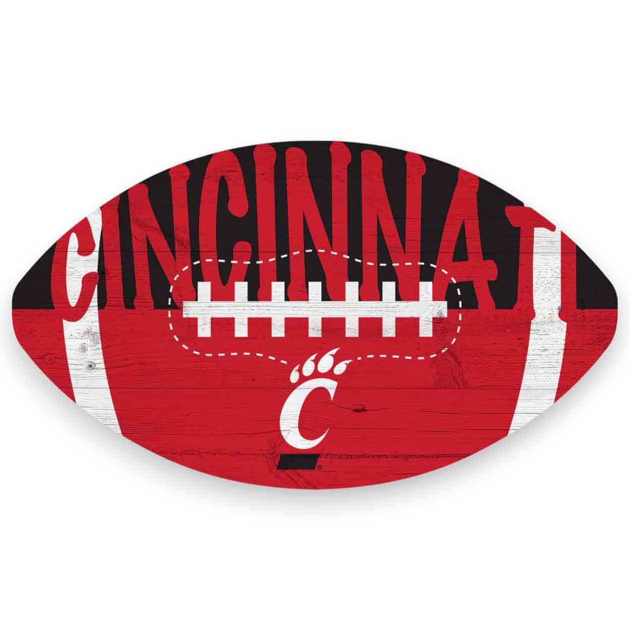 Our Cincinnati Color Football Sign is decorated with the school logo and colors. This officially licensed NCAA Cincinnati Color Football Sign is a distressed design to mimic the look of rustic wood. The image is printed directly on MDF wood. The sign includes an attached sawtooth hanger. This football sign is made in the USA and measures 12″ x 7″ x .25″. Just perfect for a wreath sign, home decor or a gift for that special football fan.FAQs