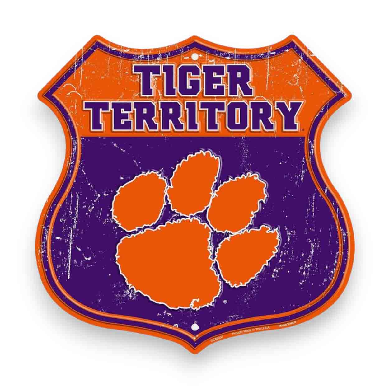 Show your spirit with our Clemson Shield Sign! This officially licensed NCAA Clemson Shield Sign features the team colors and logo on a shaped sign. The image is a distressed design. The lightweight weather resistant embossed aluminum sign measures 12 inches wide x 12 inches tall. It includes predrilled holes at 6 and 12 o’clock for easy mounting. This collegiate sign is made in the USA and perfect for wreaths, home decor, party decor and fan gifts!