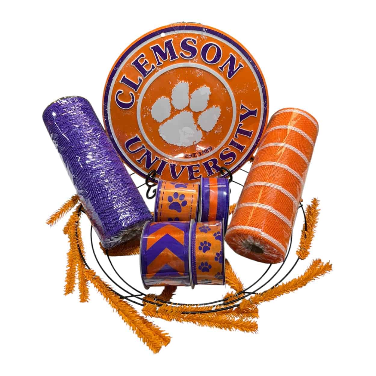 Show your team spirit with our Clemson Wreath Kit. This coordinated wreath kit includes matching ribbon, deco mesh, a wire wreath frame, and a Clemson sign to help you create a bold 24″ team-themed wreath without the guesswork. The bundle contents are fixed and pre-packed for convenience, value, and faster shipping.