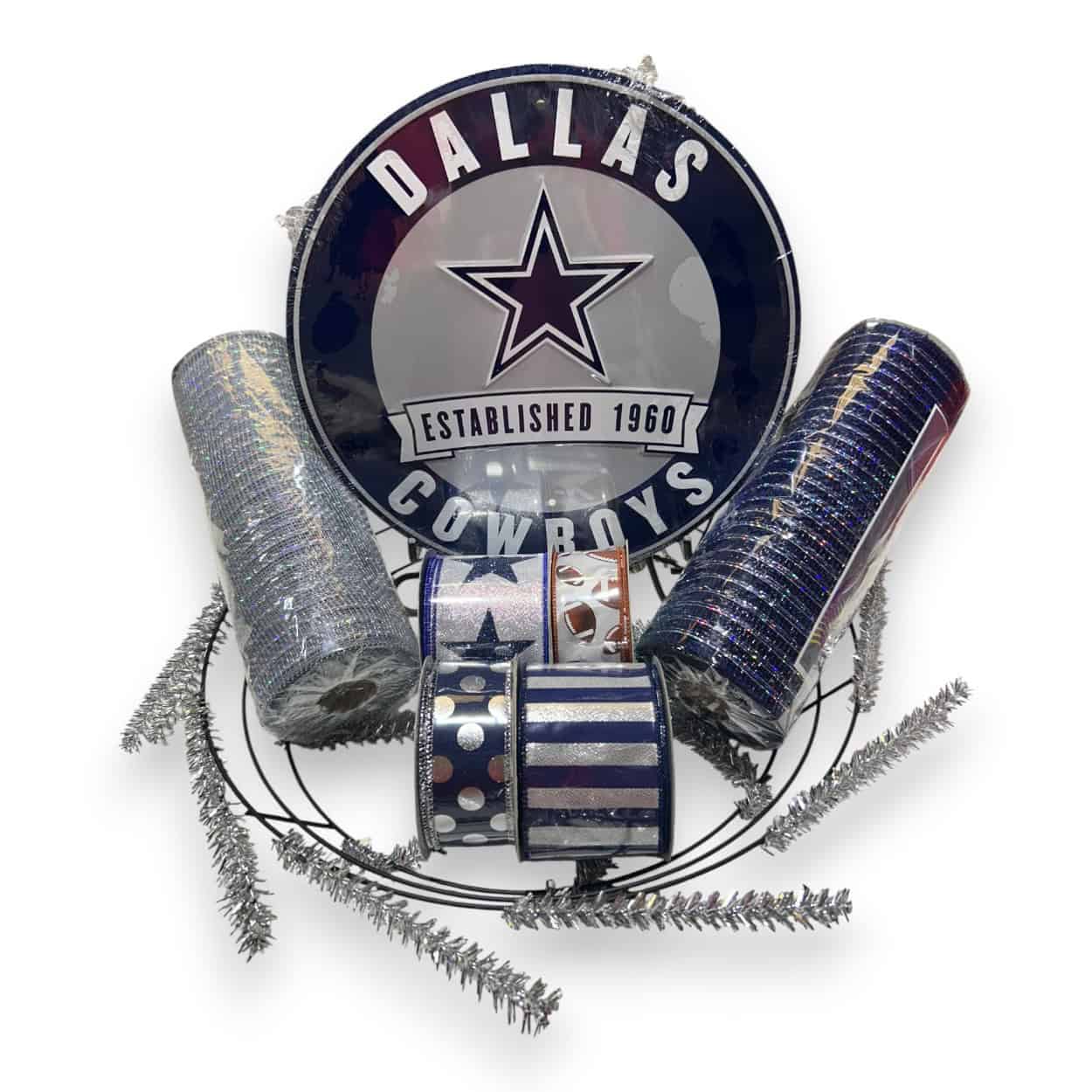 Show your team spirit with our Dallas Cowboys Wreath Kit. This coordinated wreath kit includes matching ribbon, deco mesh, a wire wreath frame, and a Dallas Cowboys sign to help you create a bold 24″ team-themed wreath without the guesswork. The bundle contents are fixed and pre-packed for convenience, value, and faster shipping.